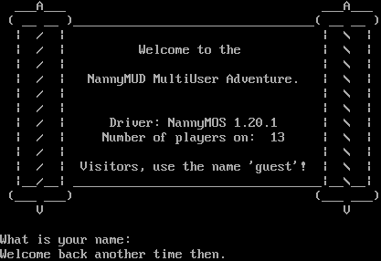 ___A___ ___A___ ( __ __ )_​________________________________( __ __ ) \| / \| \| \\ \| \| / \| Welcome to the \| \\ \| \| / \| \| \\ \| \| / \| NannyMUD MultiUser Adventure. \| \\ \| \| / \| \| \\ \| \| / \| \| \\ \| \| / \| Driver: NannyMOS 1.20.1 \| \\ \| \| / \| Number of players on: 13 \| \\ \| \| / \| \| \\ \| \| / \| Visitors, use the name 'guest'! \| \\ \| \|__/__\| _​_________________________________\|__\\__\| (___ ___) (___ ___) V V What is your name: Welcome back another time then.