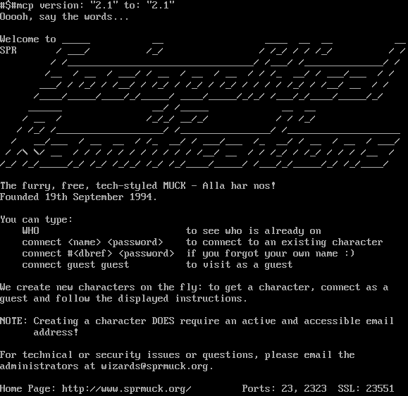 #$#mcp version: "2.1" to: "2.1" Ooooh, say the words... Welcome to _​____ __ _​___ __ __ __ SPR / ___/ /_/ / /_/ / / /_/ / / / /_​________________________________/ /___/ /_​_____________/ / /__ / __ / ___/ / __ / __ / __ / / /_ __/ / ___/___ / / ___/ / /_/ / /__/ / /_/ / /_/ / /_/ / / / / /_/ / /__/ __ / / /_​___/_​____/_​___/_/_​____/ _​___/_​____/_/_/ /___/_/_​___/_​____/_/ _​_____ __/ /_​____ __ __ / __ / /_/_/ __/_/ / / /_/ / /_/ /_​__________________/ /_​_______________/ /_​___________________ / __/___ / __ __ / /_ __/ / ___/___ /_ __/ / __ / __ / ___/ / /\\ \\/ __ / / / / / / / / / / / /__/ __ / / /_/ / /_/ / / / /__ / /_/ /_/_​____/_/ /_/ /_/_/ /_/ /_/_​___/_​____/ /___/_/_​____/_/ /_/_​___/ The furry, free, tech-styled MUCK - Alla har nos! Founded 19th September 1994. You can type: WHO to see who is already on connect <name> <password> to connect to an existing character connect #<dbref> <password> if you forgot your own name :) connect guest guest to visit as a guest We create new characters on the fly: to get a character, connect as a guest and follow the displayed instructions. NOTE: Creating a character DOES require an active and accessible email address! For technical or security issues or questions, please email the administrators at wizards@sprmuck.org. Home Page: http://www.sprmuck.org/ Ports: 23, 2323 SSL: 23551