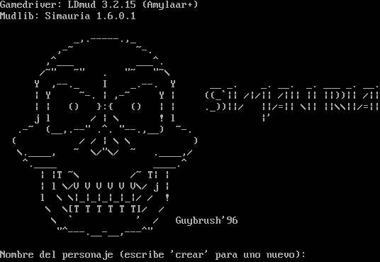 Gamedriver: LDmud 3.2.15 (Amylaar+) Mudlib: Simauria 1.6.0.1 _,.​-----.,_ ,-~ ~-. ,^​___ _​__^. /~" ~" . "~ "~\\ Y ,-​-._ I _​.--. Y __ _. _. __. _. ___ _. __. \| Y ~-. \| ,-~ Y \| ((_\`\|\| /\|/\|\| /\|\|\| \|\| \|\|))\|\| /\|\| \| \| () }:{ () \| \| ._))\|\|/ \|\|/=\|\| \\\|\| \|\|\\\\\|\|/=\|\| j l / \| \\ ! l \|' .-~ (__,.​--" .^. "​--.,__) ~-. ( / / \| \\ \\ ) \\.​____, ~ \\/"\\/ ~ .​____,/ ^​.____ _​___.^ \| \|T ~\\ /~ T\| \| \| l \\/V V V V V V\\/ j \| l \\ \\\|_\|_\|_\|_\|_\|/ / ! \\ \\[T T T T T TI/ / \\ \` ' / Guybrush'96 "​^---.__-__,-​--^" Nombre del personaje (escribe 'crear' para uno nuevo):