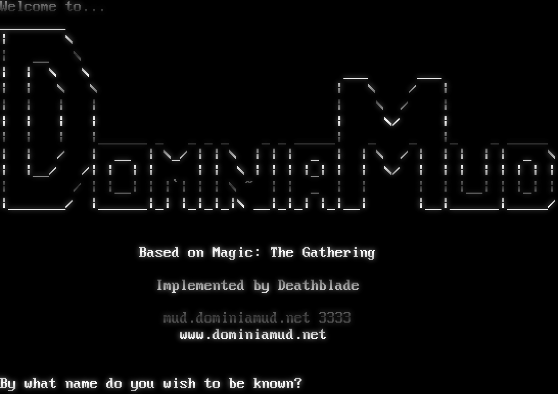 Welcome to... _​_______ \| \\ \| __ \\ \| \| \\ \\ ___ ___ \| \| \\ \\ \| \\ / \| \| \| \| \| \| \\ / \| \| \| \| \| \| \\/ \| \| \| \| \|_​_____ _ _ _ _ _ _ _​____\| _ _ \|_ _ _​____ \| \| / \| __ \| \\_/ \| \| \\ \| \| \| _ \| \| \\ / \| \| \| \| \| _ \\ \| \|__/ /\| \| \| \| \| \| \\ \| \| \| \|_\| \| \| \\/ \| \| \| \| \| \| \| \| \| / \| \|__\| \| \|\`\| \| \| \\ ~ \| \| _ \| \| \| \| \|__\| \| \|_\| \| \|_​______/ \|_​_____\|_\| \|_\|_\|_\|\\ __\|_\|_\| \|_\|__\| \|__\|_​_____\|_​____/ Based on Magic: The Gathering Implemented by Deathblade mud.dominiamud.net 3333 www.dominiamud.net By what name do you wish to be known?