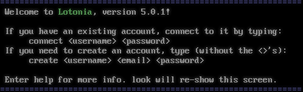 =​============================================================= Welcome to Lotonia, version 5.0.1! If you have an existing account, connect to it by typing: connect &lt;username&gt; &lt;password&gt; If you need to create an account, type (without the &lt;&gt;'s): create &lt;username&gt; &lt;email&gt; &lt;password&gt; Enter help for more info. look will re-show this screen. =​=============================================================