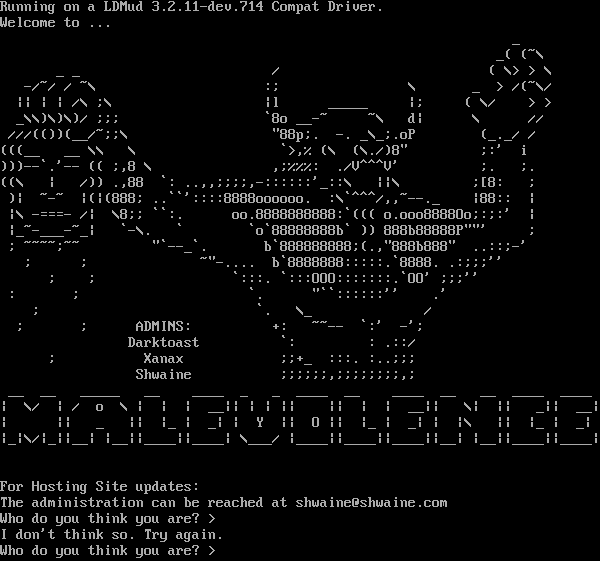 Running on a LDMud 3.2.11-dev.714 Compat Driver. Welcome to ... _ _( (~\\ _ _ / ( \\> > \\ -/~/ / ~\\ :; \\ _ > /(~\\/ \|\| \| \| /\\ ;\\ \|l _​____ \|; ( \\/ > > _\\\\)\\)\\)/ ;;; \`8o _​_-~ ~\\ d\| \\ // ///(())(__/~;;\\ "88p;. -. _\\_;.oP (_._/ / (((__ __ \\\\ \\ \`>,% (\\ (\\./)8" ;:' i )))--\`.'-- (( ;,8 \\ ,;%%%: ./V^^^V' ;. ;. ((\\ \| /)) .,88 \`: ..,,;;;;,-::::::'_::\\ \|\|\\ ;[8: ; )\| ~-~ \|(\|(888; ..\`\`'::::8888oooooo. :\\\`^^^/,,~​--._ \|88:: \| \|\\ -​===- /\| \\8;; \`\`:. oo.8888888888:\`((( o.ooo8888Oo;:;:' \| \|_​~-___-~_\| \`-\\. \` \`o\`88888888b\` )) 888b88888P""' ; ; ~​~~~;~~ "\`--_\`. b\`888888888;(.,"888b888" ..::;-' ; ; ~​"-.... b\`8888888:::::.\`8888. .:;;;'' ; ; \`:::. \`:::OOO:::::::.\`OO' ;;;'' : ; \`. "\`\`::::::'' .' ; \`. \\_ / ; ; ADMINS: +: ~​~-- \`:' -'; Darktoast \`: : .::/ ; Xanax ;;+_ :::. :..;;; Shwaine ;;;;;;,;;;;;;;;,; __ __ _​____ __ _​___ _ _ _​___ __ _​___ __ __ _​___ _​___ \| \\/ \| / o \\ \| \| \| __\|\| \| \| \|\| \|\| \| \| __\|\| \\\| \|\| _\|\| __\| \| \|\| _ \|\| \|_ \| _\| \| Y \|\| O \|\| \|_ \| _\| \| \|\\ \|\| \|_ \| _\| \|_\|\\/\|_\|\|__\| \|__\|\|_​___\|\|_​___\| \\___/ \|_​___\|\|_​___\|\|_​___\|\|__\| \|__\|\|_​___\|\|_​___\| For Hosting Site updates: The administration can be reached at shwaine@shwaine.com Who do you think you are? > I don't think so. Try again. Who do you think you are? >