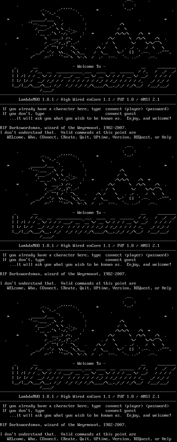 .​--. . . : : .​-._ .-'''''-. \* '--' . \\ '-'_ \`. . \* _​_____/___ '. : . \* . \`'-​-.___ _\\ / : /\\ /_​__.-' \\ \\ _:._ : / \\ .'__ _.'\\ '-/,\`-~\` : \* /\\/\\/\\ /\\ \* \* \\ _​__.> /=, ' /\\/ \\ /\\/\\ /\\ . . / _.-'/_,)"​..-' . / \\ \\/ \\/\\/~~\\ . /\` ~~( / \` ~\\_ . /\\ / \\ . ./ . / \\ \\ __/~ -'/ \\\\._ \`\\_\\__ / \\__ \\-' [] '.​--. .​-~~~, /~ /-'\` \`'=='\\ \\-.\\ / ,- :--. \`-. ..-' .​--. _ __ - Welcome To - __ _​_______ \| \| / /__ __ _​__________ ___ _​___ __ _​_____ / /_ / _/ _/ \| \| /\| / / _ \\/ / / / ___/ __ \`__ \\/ __ \\/ / / / __ \\/ __/ / / / / \| \|/ \|/ / __/ /_/ / / / / / / / / /_/ / /_/ / / / / /_ _/ /_/ / \|__/\|__/\\___/\\__, /_/ /_/ /_/ /_/\\_​___/\\__,_/_/ /_/\\__/ /___/___/ /_​___/ -​-------------------------------------------------------------------------- LambdaMOO 1.8.1 / High Wired enCore 1.1 / FUP 1.8 / ANSI 2.1 -​-------------------------------------------------------------------------- If you already have a character here, type connect <player> <password> If you don't, type connect guest ...it will ask you what you wish to be known as. Enjoy, and welcome! RIP Darkswordsman, wizard of the Weyrmount, 1982-2007. I don't understand that. Valid commands at this point are WELcome, Who, COnnect, CReate, Quit, UPtime, Version, REQuest, or Help .​--. . . : : .​-._ .-'''''-. \* '--' . \\ '-'_ \`. . \* _​_____/___ '. : . \* . \`'-​-.___ _\\ / : /\\ /_​__.-' \\ \\ _:._ : / \\ .'__ _.'\\ '-/,\`-~\` : \* /\\/\\/\\ /\\ \* \* \\ _​__.> /=, ' /\\/ \\ /\\/\\ /\\ . . / _.-'/_,)"​..-' . / \\ \\/ \\/\\/~~\\ . /\` ~~( / \` ~\\_ . /\\ / \\ . ./ . / \\ \\ __/~ -'/ \\\\._ \`\\_\\__ / \\__ \\-' [] '.​--. .​-~~~, /~ /-'\` \`'=='\\ \\-.\\ / ,- :--. \`-. ..-' .​--. _ __ - Welcome To - __ _​_______ \| \| / /__ __ _​__________ ___ _​___ __ _​_____ / /_ / _/ _/ \| \| /\| / / _ \\/ / / / ___/ __ \`__ \\/ __ \\/ / / / __ \\/ __/ / / / / \| \|/ \|/ / __/ /_/ / / / / / / / / /_/ / /_/ / / / / /_ _/ /_/ / \|__/\|__/\\___/\\__, /_/ /_/ /_/ /_/\\_​___/\\__,_/_/ /_/\\__/ /___/___/ /_​___/ -​-------------------------------------------------------------------------- LambdaMOO 1.8.1 / High Wired enCore 1.1 / FUP 1.8 / ANSI 2.1 -​-------------------------------------------------------------------------- If you already have a character here, type connect <player> <password> If you don't, type connect guest ...it will ask you what you wish to be known as. Enjoy, and welcome! RIP Darkswordsman, wizard of the Weyrmount, 1982-2007. I don't understand that. Valid commands at this point are WELcome, Who, COnnect, CReate, Quit, UPtime, Version, REQuest, or Help .​--. . . : : .​-._ .-'''''-. \* '--' . \\ '-'_ \`. . \* _​_____/___ '. : . \* . \`'-​-.___ _\\ / : /\\ /_​__.-' \\ \\ _:._ : / \\ .'__ _.'\\ '-/,\`-~\` : \* /\\/\\/\\ /\\ \* \* \\ _​__.> /=, ' /\\/ \\ /\\/\\ /\\ . . / _.-'/_,)"​..-' . / \\ \\/ \\/\\/~~\\ . /\` ~~( / \` ~\\_ . /\\ / \\ . ./ . / \\ \\ __/~ -'/ \\\\._ \`\\_\\__ / \\__ \\-' [] '.​--. .​-~~~, /~ /-'\` \`'=='\\ \\-.\\ / ,- :--. \`-. ..-' .​--. _ __ - Welcome To - __ _​_______ \| \| / /__ __ _​__________ ___ _​___ __ _​_____ / /_ / _/ _/ \| \| /\| / / _ \\/ / / / ___/ __ \`__ \\/ __ \\/ / / / __ \\/ __/ / / / / \| \|/ \|/ / __/ /_/ / / / / / / / / /_/ / /_/ / / / / /_ _/ /_/ / \|__/\|__/\\___/\\__, /_/ /_/ /_/ /_/\\_​___/\\__,_/_/ /_/\\__/ /___/___/ /_​___/ -​-------------------------------------------------------------------------- LambdaMOO 1.8.1 / High Wired enCore 1.1 / FUP 1.8 / ANSI 2.1 -​-------------------------------------------------------------------------- If you already have a character here, type connect <player> <password> If you don't, type connect guest ...it will ask you what you wish to be known as. Enjoy, and welcome! RIP Darkswordsman, wizard of the Weyrmount, 1982-2007. I don't understand that. Valid commands at this point are WELcome, Who, COnnect, CReate, Quit, UPtime, Version, REQuest, or Help