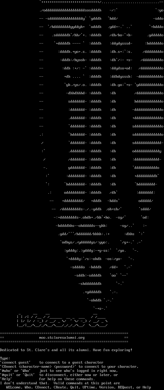 \`+​+++++++++++++++++++++++++++/.​...........................-- ./odddddddddddddddddddsosddddh -/:\` \`:yo -- -sddddddddddddddddy\` \`ydddh \`hdd/ -sddo -- \`/hddddddddyyddyh+ \`odddh .ydd+-.\` ..\` \`+hdddo -- .sddddddh\`/hh/\`+. :ddddh /dh/ho-\`+h- .ydddddo -- \`+dddddh -​--- \` :ddddh :ddydysssd- :hddddddo -- :ddddh.+yo+.s. :ddddh :dh.s+:\`:s. /ddddddddo -- :dddh:/hysoh- :ddddh :dh\`/:- +s- /dddddddddo -- :ddh :+/: -\` :ddddh :ddydso+od: /ddddddddddo -- +dh .​... \` :ddddh :ddhdysssh: -dddddddddddo -- \`yh./ys/.o. :ddddh :dh.yo:\`+s- \`ydddddddddddo -- -dhhdhhhd- :ddddh :dh /ddddddddddddo -- sddddddd- :ddddh :dh hddddddddddddo -- :ddddddd- :ddddh :dh -dddddddddddddo -- .ddddddd- :ddddh :dh +dddddddddddddo -- \`ddddddd- :ddddh :dh sdddddddddddddo .: \`hdddddd- :ddddh :dh sdddddddddddddo / \`ddddddd- :ddddh :dh sddddddddddddd- :\` .ddddddd- :ddddh :dh oddddddddddddy / /ddddddd- :ddddh :dh :dddddddddddd- -. yddddddd- :ddddh :dh \`dddddddddddo :\` :dddddddd- :ddddh :dh +dddddddddh\` \`: \`hdddddddd- :ddddh :dh \`hdddddddd- .: oddddddddd- :ddddh /dh\` :ddddddd: -- +ddddddddd/ +dddh -hdds\` oddddd/ -- /ddddddddds-./.-yddh .oh+sh/\` \`sddd/ -:+dddddddds-.ohdh+./hh\`+ho. -sy/\` \`od: -hddddhhs--ohddddds--yhh: -sy/..\` :- .ydd/\`\`\`/hdddddd/hhhh:.:+ :dhhs \`:\` \`odhys/./ydddddys/:yyo:. \`/y+-.\` .-\` :ydddy:.:ydddy:-+y-ss:\` \`/yo. \`-. \`+ddddy:\`/s:-ohdh -os:/yo- \`-. -sddddo -hdddh /dd+ \`.-\` -sddh:-sddddh \`oo\` \`--\` -shdddddddh \`-.\` .+ydddddh \`.-. \`-ohddh \`.-.\` \`-+s-.\` _ __ __ __ \| \| /\| / /__ / /_​_____ __ _ ___ / /_​___ \| \|/ \|/ / -_) / __/ _ \\/ ' \\/ -_) / __/ _ \\ \|__/\|__/\\__/_/\\__/\\___/_/_/_/\\__/ \\__/\\___/ =​============================================================= == moo.stclaresalumni.org == =​============================================================= Dedicated to St. Clare's and all its alumni. Have fun exploring! Type: 'connect guest' to connect to a guest character 'COnnect <character-name> <password>' to connect to your character, '@who' or 'Who' just to see who's logged in right now, '@quit' or 'Quit' to disconnect, either now or later, or 'Help' for help on these commands. I don't understand that. Valid commands at this point are WELcome, Who, COnnect, CReate, Quit, UPtime, Version, REQuest, or Help