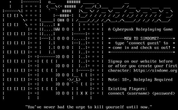 + \|-​------\| o__ #​##### _​____ _ __ \| \| = = = \| < __\\<= #​#### / ___/(_)___ _​___/ /___ _​___ ___ ___ \|-​-----\\\| = = = \| \` \` #​### \|\\__ \\/ / __ \\/ __ / __ \\/ __ \`__ \\/ _ \\ \| [] [] \\ = = = \| \|-​-####-\| \|__/ / / / / / /_/ / /_/ / / / / / / __/ \| \\= = = \|_​____\| O## O \| /_​___/_/_/ /_/\\__,_/\\_​___/_/ /_/ /_/\\___/ \| [] [] \\ = = \|\|.​...\| # \| \| = = = = \| \| \|= = \|\|.​...\|WW O O \| \| = = = = \| A Cyberpunk Roleplaying Game \| [] [] [] \|= = \|\|.​...\| \|-​----\|= = = \| \| \|= = \|---\|.\| O O O \|.​....\|= = = \| \*-​-----NEW TO SINDOME?-​-----\* \| [] [] [] \|= = \| \|.\| \|--\|..\|= = = \| \* type 'connect guest' to \* \| \|= = \| \|.\| O O O \| \|..\|= = = \| \* come in and check us out! \* \| [] [] [] \|= = \| \|.\| \| \|..\|= = = \| \*-​--------------------------\* \| \|= =\|-​------\|O O O \| \|..\|= = = \| \| [] [] [] \|= =\| [ [ [ \| \| \|..\|= = = \| Signup on our website before \| \|= =\| \|O O O \| \|..\|= = = \| or after you create your first \| [] [] [] \|= =\| [ [ [ \| \| \|-​----\|= = \| character: https://sindome.org \| \|= =\| \|O O O \|__ [ [ \|= = \| \| [] [] [] \|= =\| [ [ [ \| =>/_L> \|= = \| Note: 18+, Roleplay Required \| \|= =\| \|O O O \` \` [ [ \|= = \| \| [] [] [] \|= =\| [ [ [ \| \| \| \|= = \| Existing Players: \| \|= =\| \|O O O \| \| X X \|= = \| connect <username> <password> \| \| \| \| \| "You've never had the urge to kill yourself until now."