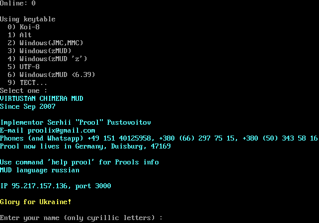 Online: 0 Using keytable 0) Koi-8 1) Alt 2) Windows(JMC,MMC) 3) Windows(zMUD) 4) Windows(zMUD 'z') 5) UTF-8 6) Windows(zMUD <6.39) 9) TECT... Select one : VIRTUSTAN CHIMERA MUD Since Sep 2007 Implementor Serhii "Prool" Pustovoitov E-mail proolix@gmail.com Phones (and Whatsapp) +49 151 40125958, +380 (66) 297 75 15, +380 (50) 343 58 16 Prool now lives in Germany, Duisburg, 47169 Use command 'help prool' for Prools info MUD language russian IP 95.217.157.136, port 3000 Glory for Ukraine! Enter your name (only cyrillic letters) :