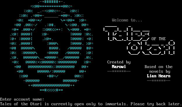 .​-+######+-. =%@@\*\*\*\*\*\*\*\*\*\*@@%= :%@% _​.-=%@@%=​-._ %@%: :%@% .=@@\*-​______-\*@@=. %@%: =@% \*@@=\*/ \\\*=@@\* %@= Welcome to... =@@ .@@%-/ .:@#. \\-%@@. @@= _​____ _ =@\* .@@@+/ :%@@%%\*+: \\+@@@. \*@= \|_ _\|_ _\| \|___ ___ .%@: @@@@\| %@- \|@@@@ :@%. \| \|/ _ \| \| -_\|_-< :@+ :@@@@\| .%@\*. \|@@@@: +@: \|_\|\\__,_\|_\|___/__/ OF THE _ =@% .@@@@\| :@@@\\ \|@@@@. %@= / _ \\\| \|_ ___ _ _(_) =@# @@@@@\\ #@@@. /@@@@@ #@= \| (_) \| _/ _ \\ '_\| \| :@% :@@@@@\\ =@@@@ /@@@@@. %@: \\___/ \\__\\___/_\| \|_\| .%@. @@@@@@\\__\*@@@@=__/@@@@@@ .@%. =@% @@@@%+%@@@@@%:@@@@@@@@ %@= Created by +@@ @@@@@@@@@@%:@@@@@@@@ @@+ Marowi Based on the +@@ @@@@@/:@@@@@ @@+ -​-======-- novels by :%@@ +#@=/ @@%: Lian Hearn -@@@@@@ @@@@@@- -​-======-- ++@@@@@@@@@@@@@@@@++ \*\*#%%%%#\*\* Enter account name: Tales of the Otori is currently open only to immortals. Please try back later.