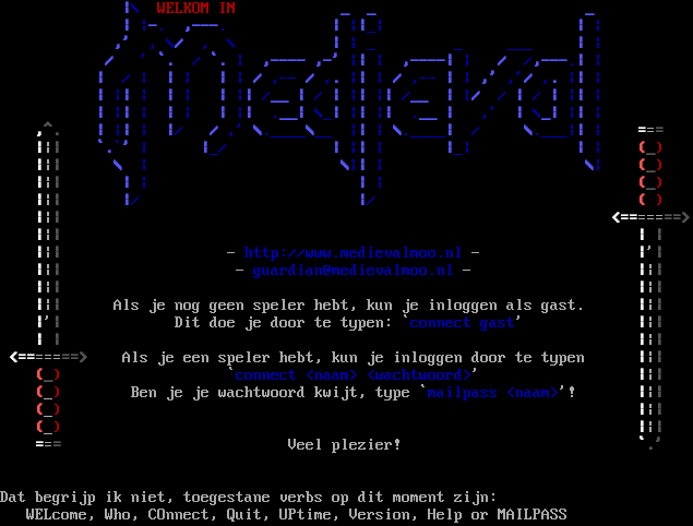 \|\\ WELKOM IN _ _ _ \| \|-. ,-​--. \| \|\|_\| \| \| ,' , \\/ , \\ \| \| _ _ ___ \| \| / ' \`. / \`. \| ,-​--- ,-' \|\| \| ,-​---\| \| / /,-​--.\| \| \| / \| \| \| \| \| / ,-- / ,. \|\| \| / ,-- \| \| ,' ,'/ ,. \|\| \| \| \|\| \| \| \| \| \|\| /__ \| / \| \|\| \|\| /__ \| \|/ / \| / \| \|\| \| \| \|\| \| \| \| \| \|\| .__\| \\_\| \|\| \|\| .__ \| ,' \| \\_\| \|\| \| ,^. \| \|\| \| \|/ / ,' \\.​____\\__ \|\| \| \\.​____\| / \\.​___\|\| \| === \|\|\| \`.\`' \| \|_/ \| \|\| \| \|_\| \| \| (_) \|\|\| \\ \| \\\|\| \| \\\| (_) \|\|\| \| \| \| \| (_) \|\|\| \|/ \|/ ( ) \|\|\| <=​======> \|\|\| \| \| \|\|\| - http://www.medievalmoo.nl - \|'\| \|\|\| - guardian@medievalmoo.nl - \|\|\| \|\|\| \|\|\| \|\|\| Als je nog geen speler hebt, kun je inloggen als gast. \|\|\| \|'\| Dit doe je door te typen: \`connect gast' \|\|\| \| \| \|\|\| <=​======> Als je een speler hebt, kun je inloggen door te typen \|\|\| (_) \`connect <naam> <wachtwoord>' \|\|\| (_) Ben je je wachtwoord kwijt, type \`mailpass <naam>'! \|\|\| (_) \|\|\| (_) \|\|\| === Veel plezier! \`.' Dat begrijp ik niet, toegestane verbs op dit moment zijn: WELcome, Who, COnnect, Quit, UPtime, Version, Help or MAILPASS