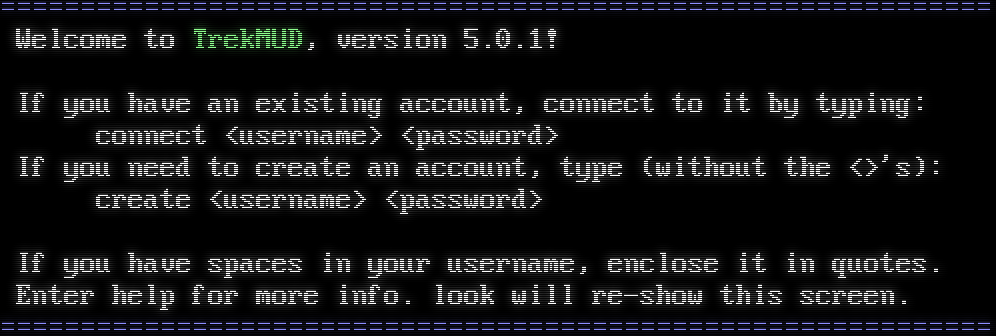 =​============================================================= Welcome to TrekMUD, version 5.0.1! If you have an existing account, connect to it by typing: connect &lt;username&gt; &lt;password&gt; If you need to create an account, type (without the &lt;&gt;'s): create &lt;username&gt; &lt;password&gt; If you have spaces in your username, enclose it in quotes. Enter help for more info. look will re-show this screen. =​=============================================================