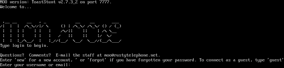 MOO version: ToastStunt v2.7.3_2 on port 7777. Welcome to... ,__ __ __ , _ __ __ ___ /\| \| \| /\\_\\//\|/ \\ () \| /\\_\\/ /\\_\\/ () / (_) \| \| \| \| \| \| \| /\\/\|\| \|\| \| /\\ \\__ \| \| \| \| \| \| \| / \|\| \|\| \|/ \\/ \| \| \|_/\\__/ \| \|_//(__/ \\__/ \\__//(__/\\___/ Type login to begin. Questions? Comments? E-mail the staff at moo@rustytelephone.net. Enter 'new' for a new account, ' or 'forgot' if you have forgotten your password. To connect as a guest, type 'guest' Enter your username or email: