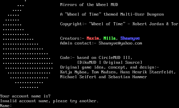 . ... Mirrors of the Wheel MUD .​... .​.... A "Wheel of Time" themed Multi-User Dungeon .​..... .​....... Copyright:- "Wheel of Time" - Robert Jordan & Tor .​........ .​.......... .​............ Creators:- Maxim, Niila, Shawnyve .​.............. Admin contact:- Shawnyve@yahoo.com .​................ .​.................. .​................... Code:- based on CircleMUD III, .​.................... [DikuMUD I Original Source] .​................... Original game idea, concept, and design:- .​................. Katja Nyboa, Tom Madsen, Hans Henrik Staerfeldt, .​............... Michael Seifert and Sebastian Hammer .​........... .​....... Please wait... Your account name is? Invalid account name, please try another. Name: