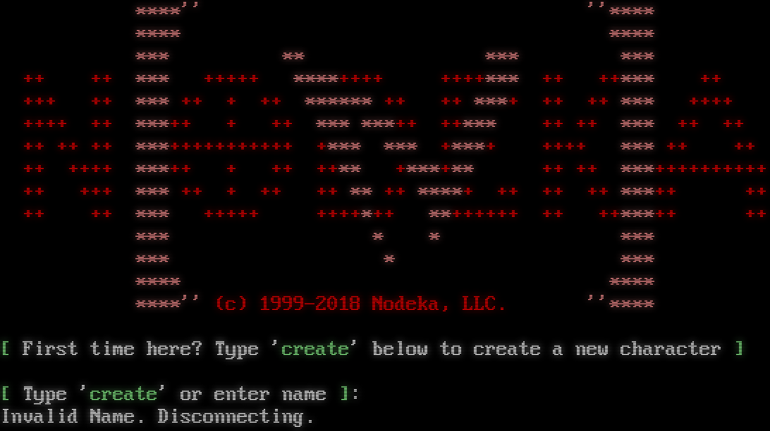 \*\*\*\*'' ''\*\*\*\* \*\*\*\* \*\*\*\* \*\*\* \*\* \*\*\* \*\*\* ++ ++ \*\*\* +​++++ \*\*\*\*+​+++ +​+++\*\*\* ++ ++\*\*\* ++ +++ ++ \*\*\* ++ + ++ \*\*\*\*\*\* ++ ++ \*\*\*+ ++ ++ \*\*\* +​+++ +​+++ ++ \*\*\*++ + ++ \*\*\* \*\*\*++ ++\*\*\* ++ ++ \*\*\* ++ ++ ++ ++ ++ \*\*\*+​++++++++++ +\*\*\* \*\*\* +\*\*\*+ +​+++ \*\*\* ++ ++ ++ +​+++ \*\*\*++ + ++ ++\*\* +\*\*\*+\*\* ++ ++ \*\*\*+​+++++++++ ++ +++ \*\*\* ++ + ++ ++ \*\* ++ \*\*\*\*+ ++ ++ ++ \*\*\*++ ++ ++ ++ \*\*\* +​++++ +​+++\*++ \*\*+​+++++ ++ ++\*\*\*++ ++ \*\*\* \* \* \*\*\* \*\*\* \* \*\*\* \*\*\*\* \*\*\*\* \*\*\*\*'' (c) 1999-2018 Nodeka, LLC. ''\*\*\*\* [ First time here? Type 'create' below to create a new character ] [ Type 'create' or enter name ]: Invalid Name. Disconnecting.