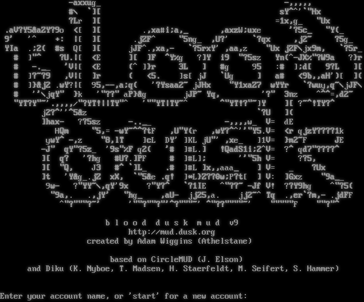 -axxug_ -,,,,, #\\ \`][ ysY^^'\`"Hxy ?Lr ][ =1x,g_ "Uxy .aV?Y5&aZY?9o <[ ][ .,xa#i;a,_ ,axzW;uxe '?5c_ "Y(_ 9' '^k +: \|[ ][ .jZF^ "5ng_ ,U?' \`?qx y,j2~ ?5g_ YIa .;2( #s Q[ ][ jJF^.,xa,- \`?5rxY' ,aa,z= "Ux jZF\\jx9m,% \`?5r_ # ]"^ k?U.\|[ d<E ][ky]F ^Y%g ?]Y# i9 d"?5sz Yn(^-JX%"?W9a ?}r # -​.__ 'V\|[ d<E (^ ]}r 3Lk ]k #g 95 :# ];d[ k9?Lk ][ # ]?~?9= ,V\|[ d]r (k -<5. ]s[ jJ \`Ugk ]V -a#- <9b,,aH')[ y]( # ]}&j2 .wY?\|[ 95,--,a;q(k '?Ysaa2~VjJHx ="Y1xaZ7 ywYYr \`?wuy,q~\\jJF\\ # ''\\jqY" }k '"??"laP}&gk jJP~kYq,I y'?" 3nz: ^​^^=,d2~k "YT?Y"~'.,,,,/"?YT!\|\|TY"^ '""YT\|TY~^ ^"YT!?"~]Y ][ ?~^!TY?^k j2?^''^5&z \`?Uy ]( ]hax- ??5sz -​..__ -,,,,w_ V= dE y HQm# "5,= -wY~^^?tF ,U"Y(r y,wY?^^''"Y5.V= <ryqjzY????1k ywY^ -,z- "8,lTyk: ]cL DY' ]KL jU"':,xe_ ]1V= }m2~F y =JE -J" 1qY"?5z_ '9s"%F q2( '# ]#L.]k !QadS1i;2^V= ?^ qd7"????^ ][ q? '?hg k#U?.]PF # ]#L]; k''"5h V= ??5, ][ "Q, J3 '#^ \`]L_ .# ]#L ]x,,aaa_k ] V= y_ d?Uxy ]t 'Y&g_.jZ =xX, \`"5&e .q! ]\*L}Z??0w;P?t[ y] V: ]Gxz "9a__ 9w- ?"YY~\\,qY'9x ?"Y?^ \`?1IE ^"??~k-Jf V! ??Y9hg ^"?5( "9a,. .,jY' k"hg_: :,aU- 'jj25,a. yjj2~^ Tq: .,er\`?m,-=.jdFF ^"?"""?~' '""?""?"'^?"​""~'d^"??"​"""~' "​""""F k""?"^k b l o o d d u s k m u d v9 http://mud.dusk.org created by Adam Wiggins (Athelstane) based on CircleMUD (J. Elson) and Diku (K. Nyboe, T. Madsen, H. Staerfeldt, M. Seifert, S. Hammer) Enter your account name, or 'start' for a new account: