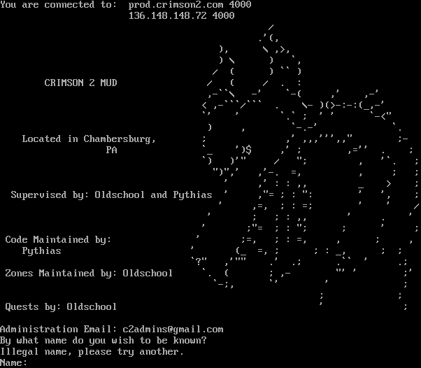 You are connected to: prod.crimson2.com 4000 136.148.148.72 4000 / .'(, ), \\ ,>, ) \\ ) \`, / ( ) \`\` ) CRIMSON 2 MUD / ( / . : ,-\`\`\\ -' \`-( ,' ,-' < ,-\`\`\`/\`\`\` . \\- )(>-:-:(_,-' \`' ' \`.\` ; ' ' \`-<" ) , \`-.-' \`. Located in Chambersburg, ; ,' ,,,''',," ;- PA \`_ ')$ ,' ; ,='' . ; \`) )'" / "; , '\`. ; ")",' ,'-. =, , ; ; ' ,' : : ,, _ > ; Supervised by: Oldschool and Pythias ' ,"= ; : ": ' ', ; ' ,=, ; : =; ' ' / ' ; ; : ,, ' . ' ' ;"= ; : "; ; ' ; Code Maintained by: ' ;=, ; : =, , ; , Pythias ' (_ =, ; ; : _, ; ; \`?" ,'"" .' .; .\`\` ' .; Zones Maintained by: Oldschool \`. ( ; ,- "' ' ;' \`-;, \`' ' ; ; ; Quests by: Oldschool ' ; Administration Email: c2admins@gmail.com By what name do you wish to be known? Illegal name, please try another. Name: