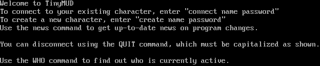Welcome to TinyMUD To connect to your existing character, enter "connect name password" To create a new character, enter "create name password" Use the news command to get up-to-date news on program changes. You can disconnect using the QUIT command, which must be capitalized as shown. Use the WHO command to find out who is currently active.