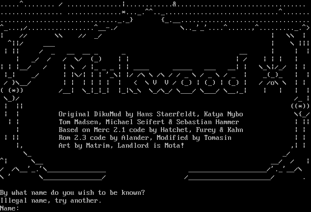 .​....^........ / .​.............\|.​...........&.​................................ .​............... .​.............\*.​.._.^^.._.............................^....... .​............................._._} {_​.__................................. ^​_...,/.​................^__-./ \\.._'_'.​...^......,^​........._.^> \| // \\\\ // _/ \| \\\\ \| ^\|\|/ ___ \| \\ \|\|\| \| \|\| / _ __ __ _ _ __ \| \| \| \| _/ / / \\/ (_) \| \| \| / \| \| \| \| \| \| \|__/ / \| \\ / \|_ _ _ \| \| _​___ _​____ ___ __\| \| \\_\\\|/_/ \| \| \|_\| _/ \| \|\\/\| \| \| '_\\\| \|/ /\\ \\ /\\ / / _ \\ / _ \\ / _ \| _(_)_ \| \| / }\\__/ \| \| \| \| \| \| \| < \\ V V / (_) \| (_) \| (_) \| / /o\\ \\ \| \| ( (\*)) /__\| \\_\|_\|_\| \|_\|\\_\\ \\_/\\_/ \\___/ \\___/ \\__,_\| \| \| \| \| \\_}/ /_ \| \| \|\| ((\*)) \| \| Original DikuMud by Hans Staerfeldt, Katya Nybo \\{_/ \| \| Tom Madsen, Michael Seifert & Sebastian Hammer \| \|\| \| Based on Merc 2.1 code by Hatchet, Furey & Kahn \| \| \| \|\| Rom 2.3 code by Alander, Modified by Tomasin \| \| \|, Art by Matrim, Landlord is Mota! ,\| \| \\_ _/ ^\| \\__ __/ / \| / /\\__'_.'\\_​______________ _​___________________/'._'__/\\ \\ ' \\_​______________/ /_​____________________/ . By what name do you wish to be known? Illegal name, try another. Name: