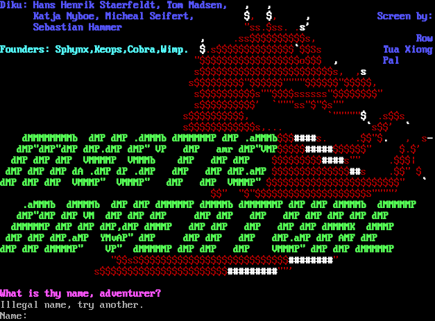 Diku: Hans Henrik Staerfeldt, Tom Madsen, , , Katja Nyboe, Micheal Seifert, $, $, , Screen by: Sebastian Hammer "ss.$ss. .s' , .ss$$$$$$$$$$s, Row Founders: Sphynx,Keops,Cobra,Wimp. $.s$$$$$$$$$$$$$$\`$$Ss Tua Xiong "$$$$$$$$$$$$$$$$$$o$$$ , Pal s$$$$$$$$$$$$$$$$$$$$$$$$s, ,s s$$$$$$$$$"$$$$$$"​"""$$$$$$"$$$$$, s$$$$$$$$$$s""$$$$ssssss"$$$$$$$$" s$$$$$$$$$$' \`"""ss"$"$s"" s$$$$$$$$$$, \`"​""""$ .s$$s s$$$$$$$$$$$$s,... \`s$$' \` dMMMMMMMMb dMP dMP .dMMMb dMMMMMMP dMP .aMMMb$$$#​###s. .$$"$. , s- dMP"dMP"dMP dMP.dMP dMP" VP dMP amr dMP"VMP$$$$$#​####$$$$$$" $.$' dMP dMP dMP VMMMMP VMMMb dMP dMP dMP $$$$$$$$$#​###s"" .$$$\| dMP dMP dMP dA .dMP dP .dMP dMP dMP dMP.aMP $$$$$$$$$$$$$$##s .$$" $ dMP dMP dMP VMMMP" VMMMP" dMP dMP VMMMP" $$$$$$$$$$$$$$$$$$$$$$$$" \` $$" "$"$$$$$$$$$$$$$$$$$$$$S"​"""' .aMMMb dMMMMb dMP dMP dMMMMMP dMMMMb dMMMMMMP dMP dMP dMMMMb dMMMMMP dMP"dMP dMP VM dMP dMP dMP dMP dMP dMP dMP dMP dMP dMP dMP dMMMMMP dMP dMP dMP,dMP dMMMP dMP dMP dMP dMP dMP dMMMMK dMMMP dMP dMP dMP.aMP YMvAP" dMP dMP dMP dMP dMP.aMP dMP AMF dMP dMP dMP dMMMMP" VP" dMMMMMP dMP dMP dMP VMMMP" dMP dMP dMMMMMP "$$sS$$$$$$$$$$$$$$$$$$$$$$$$$$$#​#######" s$$$$$$$$$$$$$$$$$$$$$$$#​########""' What is thy name, adventurer? Illegal name, try another. Name:
