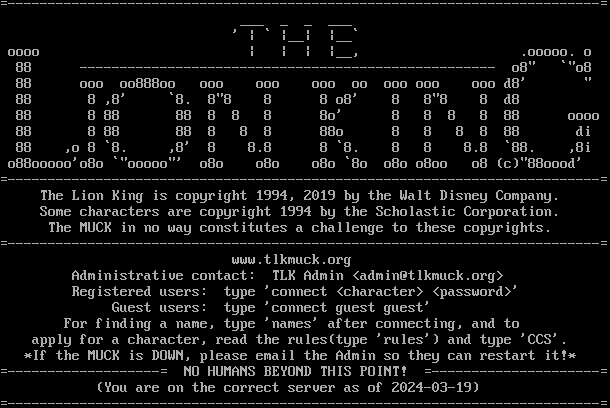 =​--------------------------------------------------------------------------= ___ _ _ ___ ' \| \` \|__\| \|__\` oooo \| \| \| \|__, .ooooo. o 88 -​--------------------------------------------------- o8" \`"o8 88 ooo oo888oo ooo ooo ooo oo ooo ooo ooo d8' " 88 8 ,8' \`8. 8"8 8 8 o8' 8 8"8 8 d8 88 8 88 88 8 8 8 8o' 8 8 8 8 88 oooo 88 8 88 88 8 8 8 88o 8 8 8 8 88 di 88 ,o 8 \`8. ,8' 8 8.8 8 \`8. 8 8 8.8 \`88. ,8i o88ooooo'o8o \`"ooooo"' o8o o8o o8o \`8o o8o o8oo o8 (c)"88oood' =​--------------------------------------------------------------------------= The Lion King is copyright 1994, 2019 by the Walt Disney Company. Some characters are copyright 1994 by the Scholastic Corporation. The MUCK in no way constitutes a challenge to these copyrights. =​--------------------------------------------------------------------------= www.tlkmuck.org Administrative contact: TLK Admin <admin@tlkmuck.org> Registered users: type 'connect <character> <password>' Guest users: type 'connect guest guest' For finding a name, type 'names' after connecting, and to apply for a character, read the rules(type 'rules') and type 'CCS'. \*If the MUCK is DOWN, please email the Admin so they can restart it!\* =​-------------------= NO HUMANS BEYOND THIS POINT! =​---------------------= (You are on the correct server as of 2024-03-19) =​--------------------------------------------------------------------------=