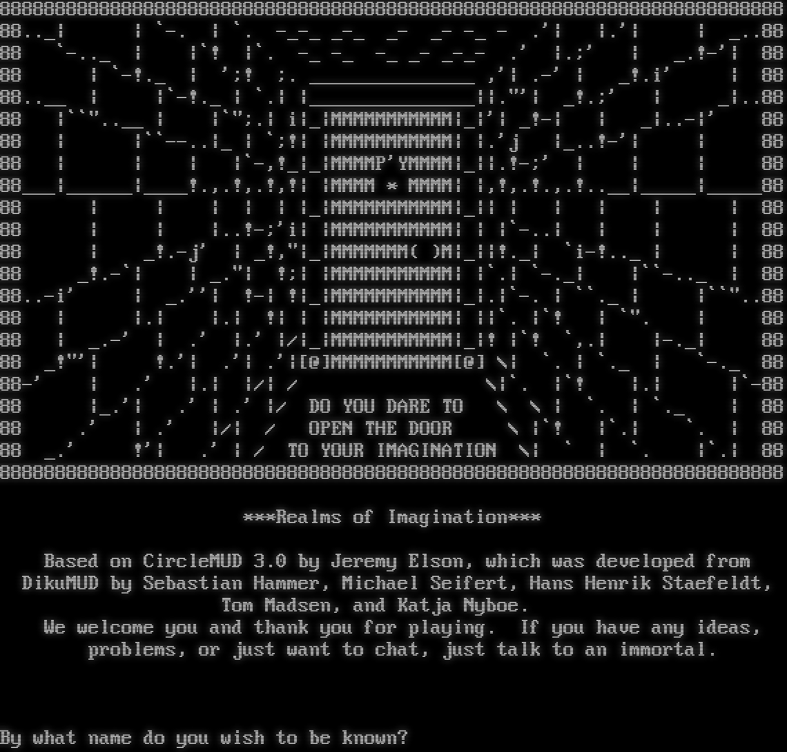 88888888888888888888888888888888888888888888888888888888888888888888888 88.._\| \| \`-. \| \`. -​_-_ _-_ _- _- -_ - .'\| \|.'\| \| _..88 88 \`-​.._ \| \|\`! \|\`. -_ -_ -_ _- _​-_- .' \|.;' \| _.!-'\| 88 88 \| \`-!._ \| ';! ;. _​______________ ,'\| .-' \| _!.i' \| 88 88.​.__ \| \|\`-!._ \| \`.\| \|_​______________\|\|."'\| _!.;' \| _\|..88 88 \|\`\`"​..__ \| \|\`";.\| i\|_\|MMMMMMMMMMM\|_\|'\| _!-\| \| _\|..-\|' 88 88 \| \|\`\`-​-..\|_ \| \`;!\| \|MMMMMMMMMMM\| \|.'j \|_..!-'\| \| 88 88 \| \| \| \|\`-,!_\|_\|MMMMP'YMMMM\|_\|\|.!-;' \| \| \| 88 88___\|_​_____\|_​___!.,.!,.!,!\| \|MMMM \* MMMM\| \|,!,.!.,.!.​.__\|_​____\|_​____88 88 \| \| \| \| \| \|_\|MMMMMMMMMMM\|_\|\| \| \| \| \| \| 88 88 \| \| \|..!-;'i\| \|MMMMMMMMMMM\| \| \|\`-..\| \| \| \| 88 88 \| _!.-j' \| _!,"\|_\|MMMMMMM( )M\|_\|\|!._\| \`i-!.._ \| \| 88 88 _!.-\`\| \| _."\| !;\| \|MMMMMMMMMMM\| \|\`.\| \`-._\| \|\`\`-​.._ \| 88 88..-i' \| _.''\| !-\| !\|_\|MMMMMMMMMMM\|_\|.\|\`-. \| \`\`._ \| \|\`\`"..88 88 \| \|.\| \|.\| !\| \| \|MMMMMMMMMMM\| \|\|\`. \|\`! \| \`". \| 88 88 \| _.-' \| .' \|.' \|/\|_\|MMMMMMMMMMM\|_\|! \|\`! \`,.\| \|-._\| 88 88 _!"'\| !.'\| .'\| .'\|[@]MMMMMMMMMMM[@] \\\| \`. \| \`._ \| \`-._ 88 88-' \| .' \|.\| \|/\| / \\\|\`. \|\`! \|.\| \|\`-88 88 \|_.'\| .' \| .' \|/ DO YOU DARE TO \\ \\ \| \`. \| \`._ \| 88 88 .' \| .' \|/\| / OPEN THE DOOR \\ \|\`! \|\`.\| \`. \| 88 88 _.' !'\| .' \| / TO YOUR IMAGINATION \\\| \` \| \`. \|\`.\| 88 88888888888888888888888888888888888888888888888888888888888888888888888 \*\*\*Realms of Imagination\*\*\* Based on CircleMUD 3.0 by Jeremy Elson, which was developed from DikuMUD by Sebastian Hammer, Michael Seifert, Hans Henrik Staefeldt, Tom Madsen, and Katja Nyboe. We welcome you and thank you for playing. If you have any ideas, problems, or just want to chat, just talk to an immortal. By what name do you wish to be known?