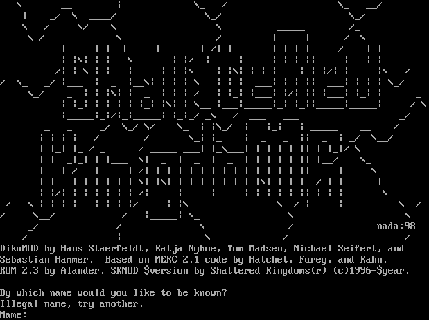 \\ __ \| \\_ / \\_ __/ \| _/ \\ _​___/ \\_/ \\_/ \\ / \\/ \\ \\ _​____ /_ \\_/ _​____ _ \\ _​______ /_ \| _ \| / \\ _ \| _ \| \| \| \|__ __\|_/\| \|_ _​____\| \| \| \| _​___/ \| \| \| \|\\\|_\| \| \\_​____ \| \|/ \|_ _\| _ \| \|_\| \|\| _ \|___\| \| ___ __ /\| \|_\\_\| \|___\|___ \| \| \|\\ \| \|\\\| \|_\| \| _ \| \| \|/\| \| _ \|\\ / / \\_ _/ \|___ \| _ \|__\\\| \| \| \| \\ \| \| \| ___\| \| \| \|\| ___\| \| \| \| \\_/ \\_/ _ \| \| \|\\\| \| _ \| \| \| / \| \|_\| \|___\| \|/\| \|\| \|___\| \|_\| \| _ \| \|_\| \| \| \| \| \|_\| \|\\\| \| \\__ \|___\|_​____\|_\| \|_\|\|_​____\|_​____\| / \\ \|_​____\|_\|/\|_\|_​____\| \|_\|_/ _\\ / ___ ___ _/ _ _ _/ \\_/ \\/ \\_ \| \|\\_/ \| \|_\| \| _​____ __ / \| \| \| \| / / \\_\| \|_ \| _ _ \|\| _ \| _/ \\__/ \| \|_\| \|_ / _ / _​____ ___\| \|_\\___\| \| \| \| \| \|\| \| \|_\|/ \\ \| \| _\|_\| \| \|___ \\\| _ \| _ \| _ \| \| \| \| \| \|\| \|__/ \\_ \| \|_/_ \| _ \| /\| \| \| \| \| \| \| \| \| \| \| \| \| \| \|\|___ \| \\ \| \|_ \| \| \| \| \| \| \\\| \|\\\| \| \|_\| \| \|_\| \| \|\\\| \| \| \| _/ \| \| \| ___ \| \|/\| \| \|_\| \| \| \| /\|___ \|_​____\|_​____\|_\| \|_\| \|_\|\| \|_\| \| \\__ _ / \\ \|_\| \|_\|___\|_\| \|_\|/ ___\| \|\\ \\_ / \|_​____\| \\_ / / \\__/ / \|_​____\| \\_ \\ \\ _/ / \\ / --nada:98-- / \| \\ / / DikuMUD by Hans Staerfeldt, Katja Nyboe, Tom Madsen, Michael Seifert, and Sebastian Hammer. Based on MERC 2.1 code by Hatchet, Furey, and Kahn. ROM 2.3 by Alander. SKMUD $version by Shattered Kingdoms(r) (c)1996-$year. By which name would you like to be known? Illegal name, try another. Name: