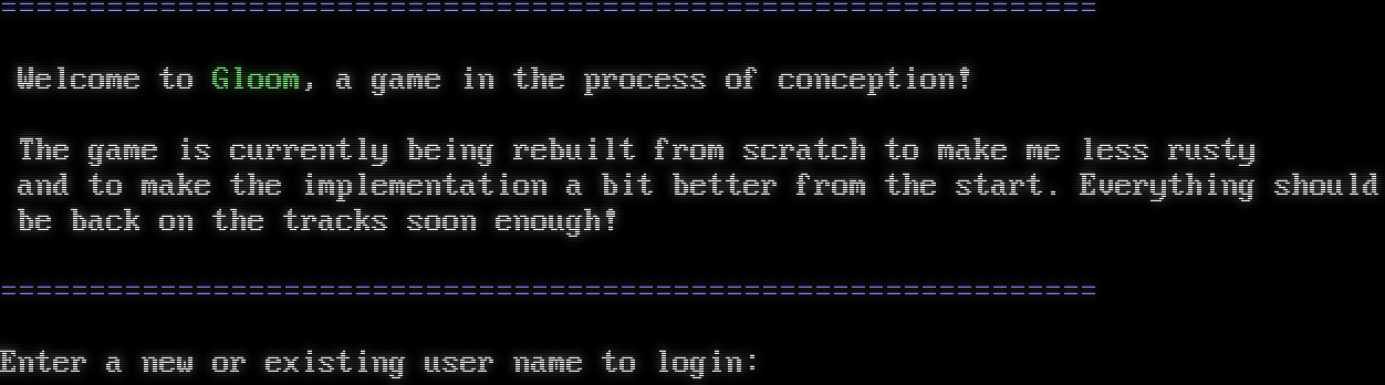 =​============================================================= Welcome to Gloom, a game in the process of conception! The game is currently being rebuilt from scratch to make me less rusty and to make the implementation a bit better from the start. Everything should be back on the tracks soon enough! =​============================================================= Enter a new or existing user name to login: