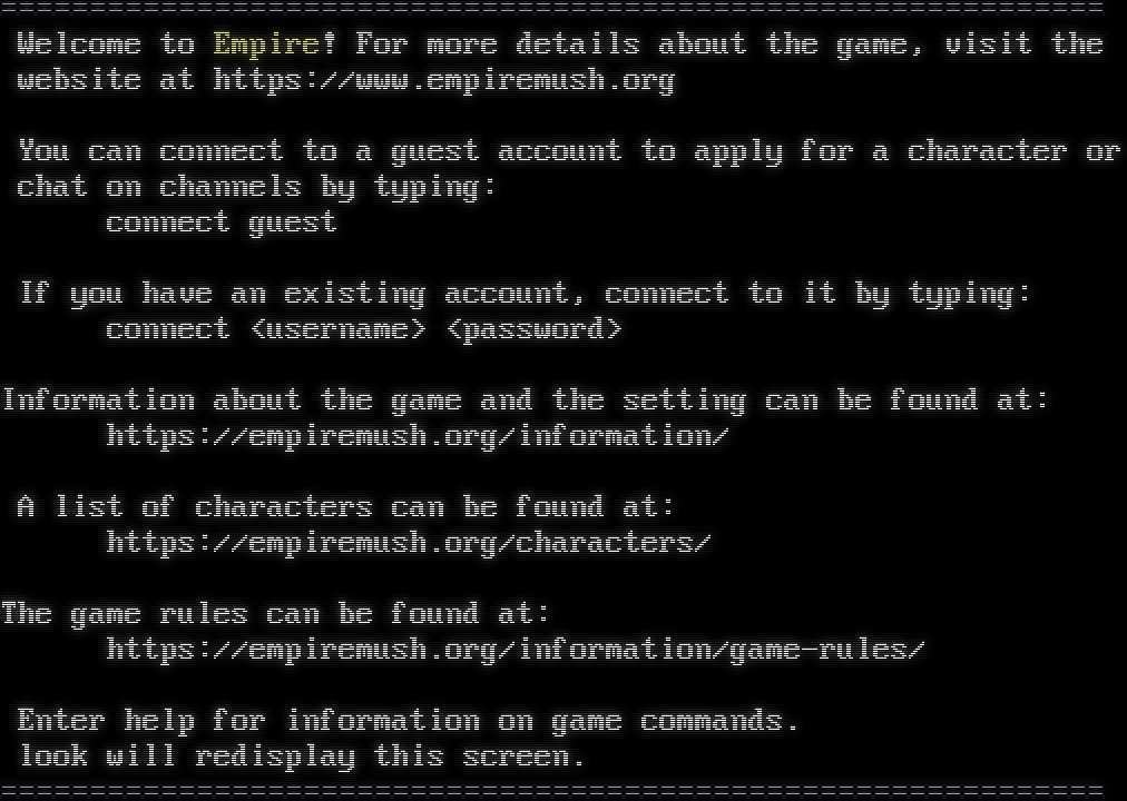 =​============================================================= Welcome to Empire! For more details about the game, visit the website at https://www.empiremush.org You can connect to a guest account to apply for a character or chat on channels by typing: connect guest If you have an existing account, connect to it by typing: connect &lt;username&gt; &lt;password&gt; Information about the game and the setting can be found at: https://empiremush.org/information/ A list of characters can be found at: https://empiremush.org/characters/ The game rules can be found at: https://empiremush.org/information/game-rules/ Enter help for information on game commands. look will redisplay this screen. =​=============================================================