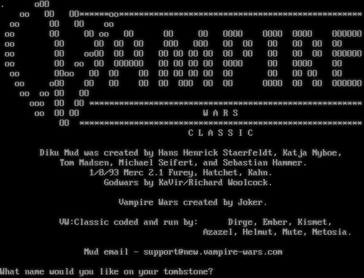. oOO oo OO OO\*\*\*\*\*\*oo\*\*\*\*\*\*\*\*\*\*\*\*\*\*\*\*\*\*\*\*\*\*\*\*\*\*\*\*\*\*\*\*\*\*\*\*\*\*\*\*\*\*\*\*\*\*\*\*\* oo OO OO oo oo OO OO oo OO OO OO OOOO OOOO OOOO OOOOOO oo OO OO OO OO OOO OOO OO OO OO OO OO OO oo OO ooOO OO OO OO OO OO OO OO OO OO OO OO OOOOOO oo OO oo OO OOOOOO OO OO OO OO OOOO OO OOOO OO oo OOoo OO OO OO OO OO OO OO OO OO OO OO OO oo oOO OO OO OO OO OOO OO OO OOOO OO OO OOOOOO oo oo OO OO ooo OO OO \*\*\*\*\*\*\*\*\*\*\*\*\*\*\*\*\*\*\*\*\*\*\*\*\*\*\*\*\*\*\*\*\*\*\*\*\*\*\*\*\*\*\*\*\*\*\*\*\*\*\*\*\*\*\* oo OO OO W A R S OO \*\*\*\*\*\*\*\*\*\*\*\*\*\*\*\*\*\*\*\*\*\*\*\*\*\*\*\*\*\*\*\*\*\*\*\*\*\*\*\*\*\*\*\*\*\*\*\*\*\*\*\*\*\*\*\*\* C L A S S I C Diku Mud was created by Hans Henrick Staerfeldt, Katja Nyboe, Tom Madsen, Michael Seifert, and Sebastian Hammer. 1/8/93 Merc 2.1 Furey, Hatchet, Kahn. Godwars by KaVir/Richard Woolcock. Vampire Wars created by Joker. VW:Classic coded and run by: Dirge, Ember, Kismet, Azazel, Helmut, Mute, Netosia. Mud email - support@new.vampire-wars.com What name would you like on your tombstone?