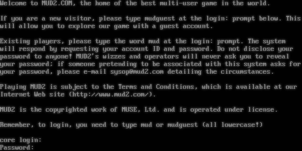 Welcome to MUD2.COM, the home of the best multi-user game in the world. If you are a new visitor, please type mudguest at the login: prompt below. This will allow you to explore our game with a guest account. Existing players, please type the word mud at the login: prompt. The system will respond by requesting your account ID and password. Do not disclose your password to anyone! MUD2's wizzes and operators will never ask you to reveal your password; if someone pretending to be associated with this system asks for your password, please e-mail sysop@mud2.com detailing the circumstances. Playing MUD2 is subject to the Terms and Conditions, which is available at our Internet Web site (http://www.mud2.com/). MUD2 is the copyrighted work of MUSE, Ltd. and is operated under license. Remember, to login, you need to type mud or mudguest (all lowercase!) core login: Password: