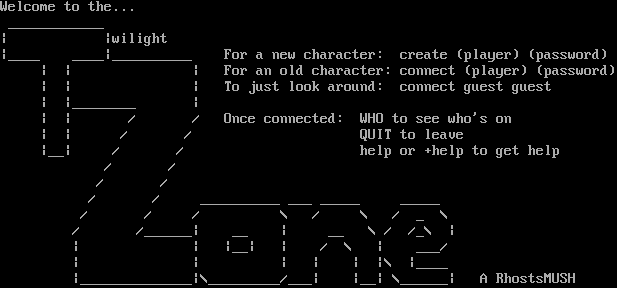 Welcome to the... _​___________ \| \|wilight \|_​___ _​___\|_​_________ For a new character: create (player) (password) \| \| \| For an old character: connect (player) (password) \| \| \| To just look around: connect guest guest \| \|_​_______ \| \| \| / / Once connected: WHO to see who's on \| \| / / QUIT to leave \|__\| / / help or +help to get help / / / / / / _​_________ ___ _​____ _​____ / / / \\ / \\ / _ \\ / /_​_____\| __ \| __ \\ / /_\\ \| \| \| \|__\| \| / \\ \| ___/ \| \| \| \| \| \|\\ \|_​___ \|_​_____________\|\\_​________/___\| \|__\| \\_​_____\| A RhostsMUSH