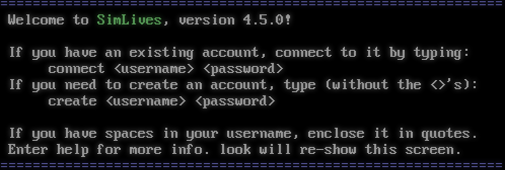 =​============================================================= Welcome to SimLives, version 4.5.0! If you have an existing account, connect to it by typing: connect &lt;username&gt; &lt;password&gt; If you need to create an account, type (without the &lt;&gt;'s): create &lt;username&gt; &lt;password&gt; If you have spaces in your username, enclose it in quotes. Enter help for more info. look will re-show this screen. =​=============================================================