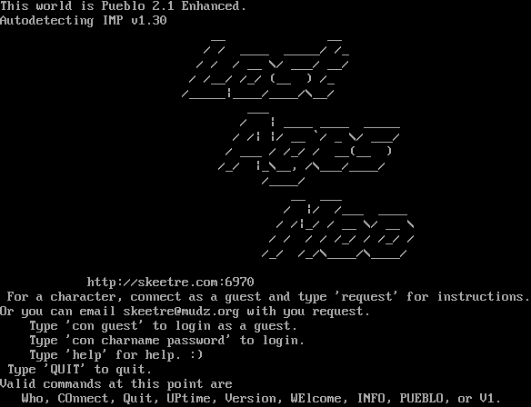 This world is Pueblo 2.1 Enhanced. Autodetecting IMP v1.30 __ __ / / _​___ _​____/ /_ / / / __ \\/ ___/ __/ / /__/ /_/ (__ ) /_ /_​____\|_​___/_​___/\\__/ ___ / \| _​___ _​___ _​____ / /\| \|/ __ \`/ _ \\/ ___/ / ___ / /_/ / __(__ ) /_/ \|_\\__, /\\___/_​___/ /_​___/ __ ___ / \|/ /___ _​___ / /\|_/ / __ \\/ __ \\ / / / / /_/ / /_/ / /_/ /_/\\_​___/\\_​___/ http://skeetre.com:6970 For a character, connect as a guest and type 'request' for instructions. Or you can email skeetre@mudz.org with you request. Type 'con guest' to login as a guest. Type 'con charname password' to login. Type 'help' for help. :) Type 'QUIT' to quit. Valid commands at this point are Who, COnnect, Quit, UPtime, Version, WElcome, INFO, PUEBLO, or V1.