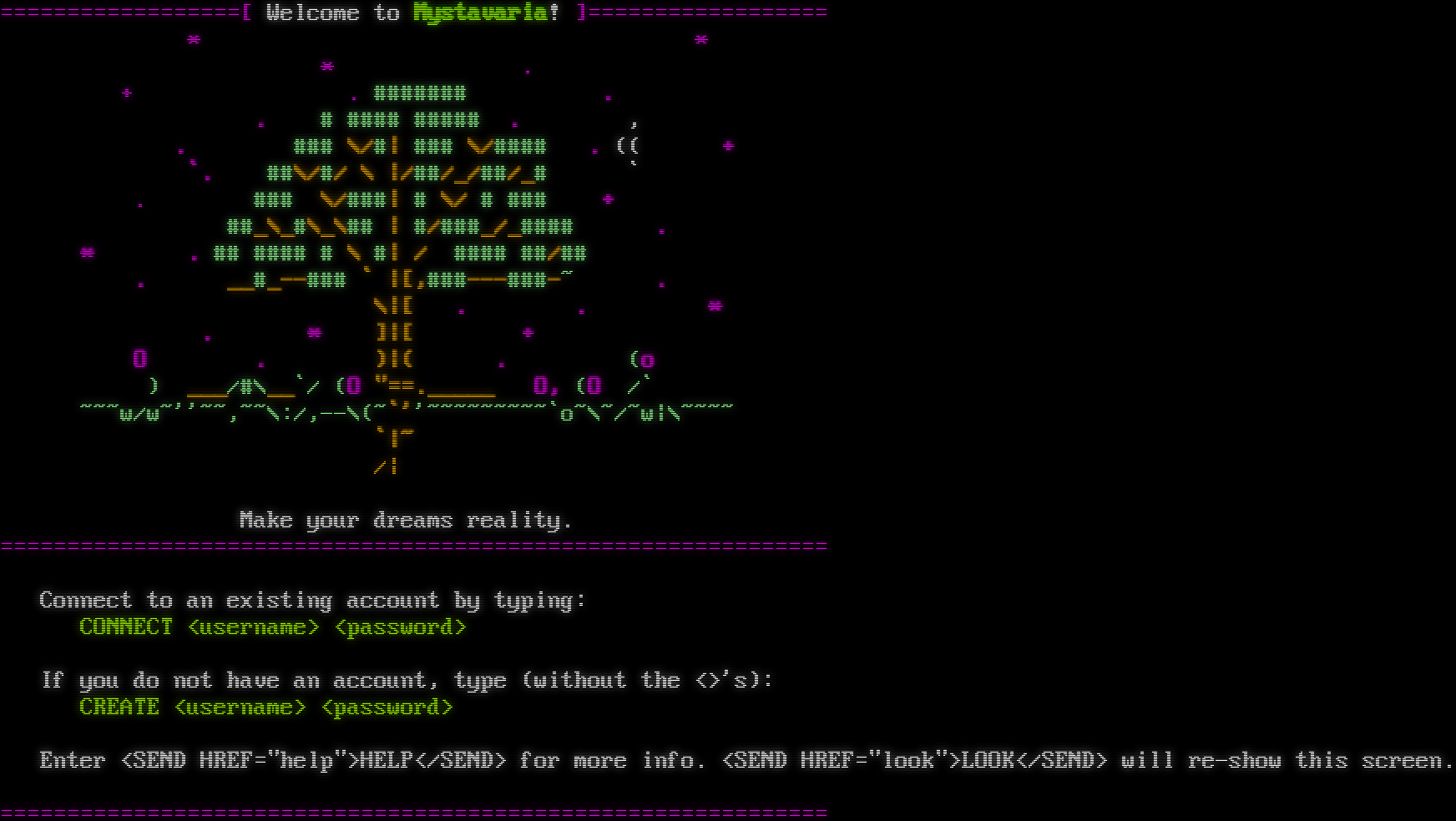 =​=================[ Welcome to Mystavaria! ]=​================= \* \* \* . + . #​###### . . # #​### #​#### . , . ### \\/#\| ### \\/#​### . (( + \`. ##\\/#/ \\ \|/##/_/##/_# \` . ### \\/###\| # \\/ # ### + ##_\\_#\\_\\## \| #/#​##_/_​#### . \* . ## #​### # \\ #\| / #​### ##/## . _​_#_--### \` \|[,#​##---###-~ . \\\|[ . . \* . \* ]\|[ + O . )\|( . (o ) ___/#\\__\`/ (O "​==._____ O, (O /\` ~~~w/w~''~~,~~\\:/,--\\(~\`''~​~~~~~~~~\`o~\\~/~w\|\\~​~~~ \`\|~ /\| Make your dreams reality. =​============================================================= Connect to an existing account by typing: CONNECT &lt;username&gt; &lt;password&gt; If you do not have an account, type (without the &lt;&gt;'s): CREATE &lt;username&gt; &lt;password&gt; Enter <SEND HREF="help">HELP</SEND> for more info. <SEND HREF="look">LOOK</SEND> will re-show this screen. =​=============================================================