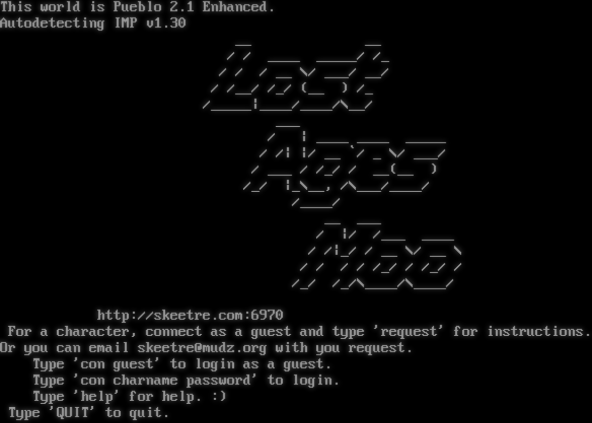 This world is Pueblo 2.1 Enhanced. Autodetecting IMP v1.30 __ __ / / _​___ _​____/ /_ / / / __ \\/ ___/ __/ / /__/ /_/ (__ ) /_ /_​____\|_​___/_​___/\\__/ ___ / \| _​___ _​___ _​____ / /\| \|/ __ \`/ _ \\/ ___/ / ___ / /_/ / __(__ ) /_/ \|_\\__, /\\___/_​___/ /_​___/ __ ___ / \|/ /___ _​___ / /\|_/ / __ \\/ __ \\ / / / / /_/ / /_/ / /_/ /_/\\_​___/\\_​___/ http://skeetre.com:6970 For a character, connect as a guest and type 'request' for instructions. Or you can email skeetre@mudz.org with you request. Type 'con guest' to login as a guest. Type 'con charname password' to login. Type 'help' for help. :) Type 'QUIT' to quit.