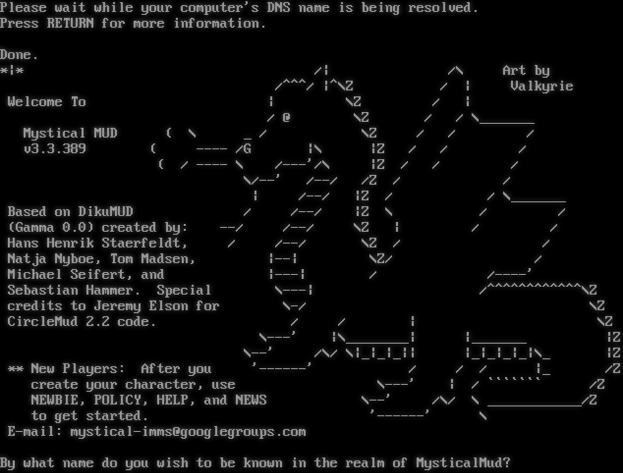 Please wait while your computer's DNS name is being resolved. Press RETURN for more information. Done. \*\|\* /\| /\\ Art by /^^^/ \|^\\Z / \| Valkyrie Welcome To \| \\Z / \| / @ \\Z / / \\_​______ Mystical MUD ( \\ _ / \\Z / / / v3.3.389 ( -​--- /G \|\\ \|Z / / / ( / -​--- \\ /---'/\\ \|Z / / / \\/--' /--/ /Z / / \| /--/ \|Z / / \\_​______ Based on DikuMUD / /--/ \|Z \\ / / (Gamma 0.0) created by: --/ /--/ \\Z \| / / Hans Henrik Staerfeldt, / /--/ \\Z / / Natja Nyboe, Tom Madsen, \|--\| \\Z/ / Michael Seifert, and \|---\| / /-​---' Sebastian Hammer. Special \\---\| /^​^^^^^^^^^^^\\Z credits to Jeremy Elson for \\-/ \\Z CircleMud 2.2 code. / / \| \\Z \\---' \|\\_​_______\| \|_​______ \|Z \\--' /\\/ \\\|_\|_\|_\|\| \|_\|_\|_\|_\|\\_ \|Z \*\* New Players: After you '-​-----' / / / \|_ /Z create your character, use \\---' \| / \`\`\`\`\`\`\` /Z NEWBIE, POLICY, HELP, and NEWS \\--' /\\/ \\ _​___________/Z to get started. '-​-----' \\ E-mail: mystical-imms@googlegroups.com By what name do you wish to be known in the realm of MysticalMud?