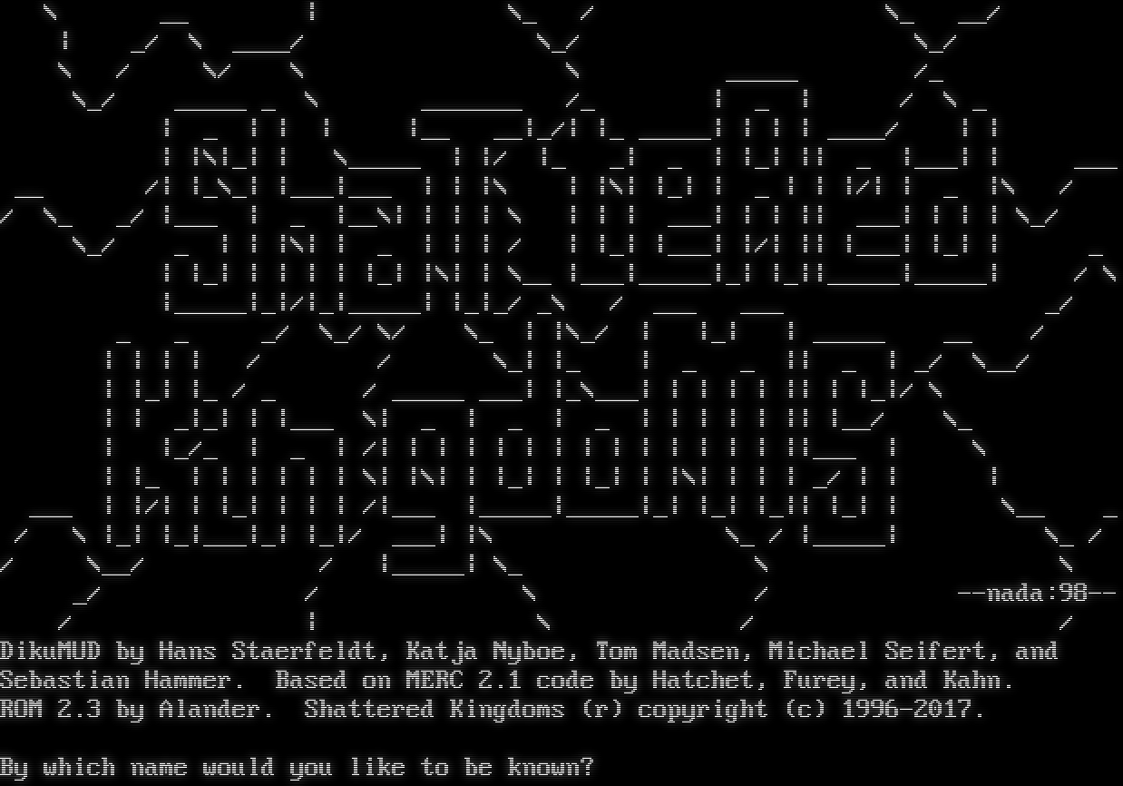 \\ __ \| \\_ / \\_ __/ \| _/ \\ _​___/ \\_/ \\_/ \\ / \\/ \\ \\ _​____ /_ \\_/ _​____ _ \\ _​______ /_ \| _ \| / \\ _ \| _ \| \| \| \|__ __\|_/\| \|_ _​____\| \| \| \| _​___/ \| \| \| \|\\\|_\| \| \\_​____ \| \|/ \|_ _\| _ \| \|_\| \|\| _ \|___\| \| ___ __ /\| \|_\\_\| \|___\|___ \| \| \|\\ \| \|\\\| \|_\| \| _ \| \| \|/\| \| _ \|\\ / / \\_ _/ \|___ \| _ \|__\\\| \| \| \| \\ \| \| \| ___\| \| \| \|\| ___\| \| \| \| \\_/ \\_/ _ \| \| \|\\\| \| _ \| \| \| / \| \|_\| \|___\| \|/\| \|\| \|___\| \|_\| \| _ \| \|_\| \| \| \| \| \|_\| \|\\\| \| \\__ \|___\|_​____\|_\| \|_\|\|_​____\|_​____\| / \\ \|_​____\|_\|/\|_\|_​____\| \|_\|_/ _\\ / ___ ___ _/ _ _ _/ \\_/ \\/ \\_ \| \|\\_/ \| \|_\| \| _​____ __ / \| \| \| \| / / \\_\| \|_ \| _ _ \|\| _ \| _/ \\__/ \| \|_\| \|_ / _ / _​____ ___\| \|_\\___\| \| \| \| \| \|\| \| \|_\|/ \\ \| \| _\|_\| \| \|___ \\\| _ \| _ \| _ \| \| \| \| \| \|\| \|__/ \\_ \| \|_/_ \| _ \| /\| \| \| \| \| \| \| \| \| \| \| \| \| \| \|\|___ \| \\ \| \|_ \| \| \| \| \| \| \\\| \|\\\| \| \|_\| \| \|_\| \| \|\\\| \| \| \| _/ \| \| \| ___ \| \|/\| \| \|_\| \| \| \| /\|___ \|_​____\|_​____\|_\| \|_\| \|_\|\| \|_\| \| \\__ _ / \\ \|_\| \|_\|___\|_\| \|_\|/ ___\| \|\\ \\_ / \|_​____\| \\_ / / \\__/ / \|_​____\| \\_ \\ \\ _/ / \\ / --nada:98-- / \| \\ / / DikuMUD by Hans Staerfeldt, Katja Nyboe, Tom Madsen, Michael Seifert, and Sebastian Hammer. Based on MERC 2.1 code by Hatchet, Furey, and Kahn. ROM 2.3 by Alander. Shattered Kingdoms (r) copyright (c) 1996-2017. By which name would you like to be known?