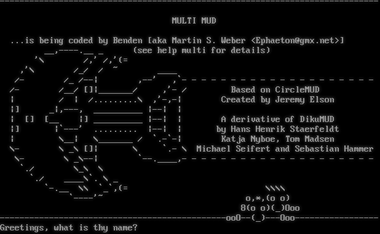 -​---------------------------------------------------------------------------- MULTI MUD ...is being coded by Benden [aka Martin S. Weber <Ephaeton@gmx.net>] __,-​---.__ _ (see help multi for details) '\\ /,' /,'(= ,'\\ /_/ / ~ _​___ /- /_ /--\| ,--' ,\`- - - - - - - - - - - - - - - - - - - - /- /__/ []\|_​______/ ,'- / Based on CircleMUD \| / \| /.​........\\ ,'-,-\| Created by Jeremy Elson \|] _\|,---, _​_________ \|--\| \| \| [] [__ \|] _​_________ \|--\| \| A derivative of DikuMUD \|] \|\`---' .​........ \|--\| \| by Hans Henrik Staerfeldt \| \\__\| \\_​______ / \`.-\`-\| Katja Nyboe, Tom Madsen \\- \\ _\\ []\| \\ \`.- \\ Michael Seifert and Sebastian Hammer \\- \\ _\\--\| \`-​-.____,- - - - - - - - - - - - - - - - - - - - \`./ \\_\\ \\ \`./ _​___\\\`. \\ _ \`-​.__ \\\\ \`_\`,(= \\\\\\\\ \`-​---'~ o,\*,(o o) 8(o o)(_)Ooo -​---------------------------------------------ooO--(_)---Ooo-​---------------- Greetings, what is thy name?