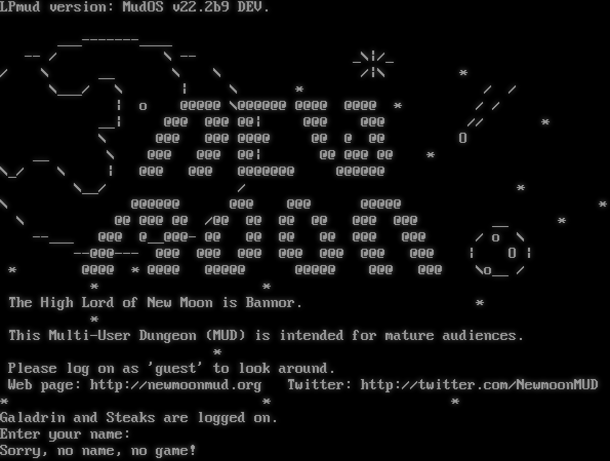 LPmud version: MudOS v22.2b9 DEV. _​__-------____ -- / \\ -- _\\\|/_ / \\ __ \\ \\ /\|\\ \* \\___/ \\ \| \\ \* / / \| o @@@@@ \\@@@@@@ @@@@ @@@@ \* / / __\| @@@ @@@ @@\| @@@ @@@ // \* \\ @@@ @@@ @@@@ @@ @ @@ O __ \\ @@@ @@@ @@\| @@ @@@ @@ \* \\_/ \\ \| @@@ @@@ @@@@@@@ @@@@@@ \\__/ / \* \\ @@@@@@ @@@ @@@ @@@@@ \* \\ @@ @@@ @@ /@@ @@ @@ @@ @@@ @@@ __ \* -​-___ @@@ @__@@@- @@ @@ @@ @@ @@@ @@@ / o \\ --@@@--- @@@ @@@ @@@ @@@ @@@ @@@ @@@ \| O \| \* @@@@ \* @@@@ @@@@@ @@@@@ @@@ @@@ \\o__ / \* \* The High Lord of New Moon is Bannor. \* \* This Multi-User Dungeon (MUD) is intended for mature audiences. \* Please log on as 'guest' to look around. Web page: http://newmoonmud.org Twitter: http://twitter.com/NewmoonMUD \* \* \* Galadrin and Steaks are logged on. Enter your name: Sorry, no name, no game!