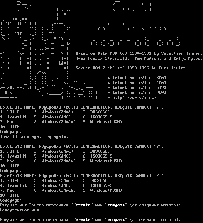 ._ __ \|\*'--., / _ _ ( \|_ \|.​--^' \|-​.-., \\__ (_) (_\| _) \|_ \| \|.-=' ,, .==,,==, _ \| _ __ \| I\|' \|\| ''\| \| __ ,=​===, _ _ (_ (_ _ _ _ \| '' ^^ ''\| \|=:\|\| \|\|'\| (_) \| __) (-\` \\/ (-\` \| ) \|_,,=='TT===,_\| \| ^^ '' \| \\:+ \`'-_=:/ \|_,==Y''Y==,\| \| _ _ _ _ _ _ \|_ . _ _ ( \|= -_=\| \\#=- \` _=\|/ \| \| ) (_ (_\| \| \| ) (_\| \|_ \| (_) \| ) _) __\|= -_=\|_..,,:-;- _=\| -:\|= /^\\-_=\| . .​-_=\|- /\\=\| Based on Diku MUD (c) 1990-1991 by Sebastien Hammer, :_\|= \| \|-_=\| . .​-_=\|- \|\|=\| Hans Henrik Staerfeldt, Tom Madsen, and Katja Nyboe. -:\|= \|_\|-_=\| . .​-_=\|- LJ=\| : \|= -_=\|. ._- =\|- _=\| Server ROM 2.4b2 (c) 1993-1995 by Russ Taylor. -:\|= -_=\| ./^\\\\=\|- _=\| :_\|= -_=\|,\| \|\|=\|-_,_ \| \* telnet mud.c7i.ru 3000 -:\|= -_=\|.\| \|\|.,\` \\,.-''--, \* telnet mud.c7i.ru 4000 /-\|/#.,--,#\\\|,\|_.-'\`\`\`\`\`., '-._,_'---, \* telnet mud.c7i.ru 5190 ###\\ ''=,_​____/=;...,__'.;:;\| \* telnet mud.c7i.ru 9000 -​-----+________.\`' \|::::::::::::;\| \* http://www.c7i.ru/ BbI6EPuTE HOMEP KOgupoBKu (EC(lu COMHEBAETECb, BBEguTE CuMBO(l '?'): 1. KOI-8 2. Windows(ZMud) 3. DOS(866) 4. Translit 5. Windows(JMC) 6. ISO8859-5 7. Mac 8. Windows(ZMud6) 9. Windows(MUSH) 10. UTF8 Codepage: Invalid codepage, try again. BbI6EPuTE HOMEP KOgupoBKu (EC(lu COMHEBAETECb, BBEguTE CuMBO(l '?'): 1. KOI-8 2. Windows(ZMud) 3. DOS(866) 4. Translit 5. Windows(JMC) 6. ISO8859-5 7. Mac 8. Windows(ZMud6) 9. Windows(MUSH) 10. UTF8 Codepage: BbI6EPuTE HOMEP KOgupoBKu (EC(lu COMHEBAETECb, BBEguTE CuMBO(l '?'): 1. KOI-8 2. Windows(ZMud) 3. DOS(866) 4. Translit 5. Windows(JMC) 6. ISO8859-5 7. Mac 8. Windows(ZMud6) 9. Windows(MUSH) 10. UTF8 Codepage: Введите имя Вашего персонажа ("create" или "создать" для создания нового): Некорректное имя. Введите имя Вашего персонажа ("create" или "создать" для создания нового):