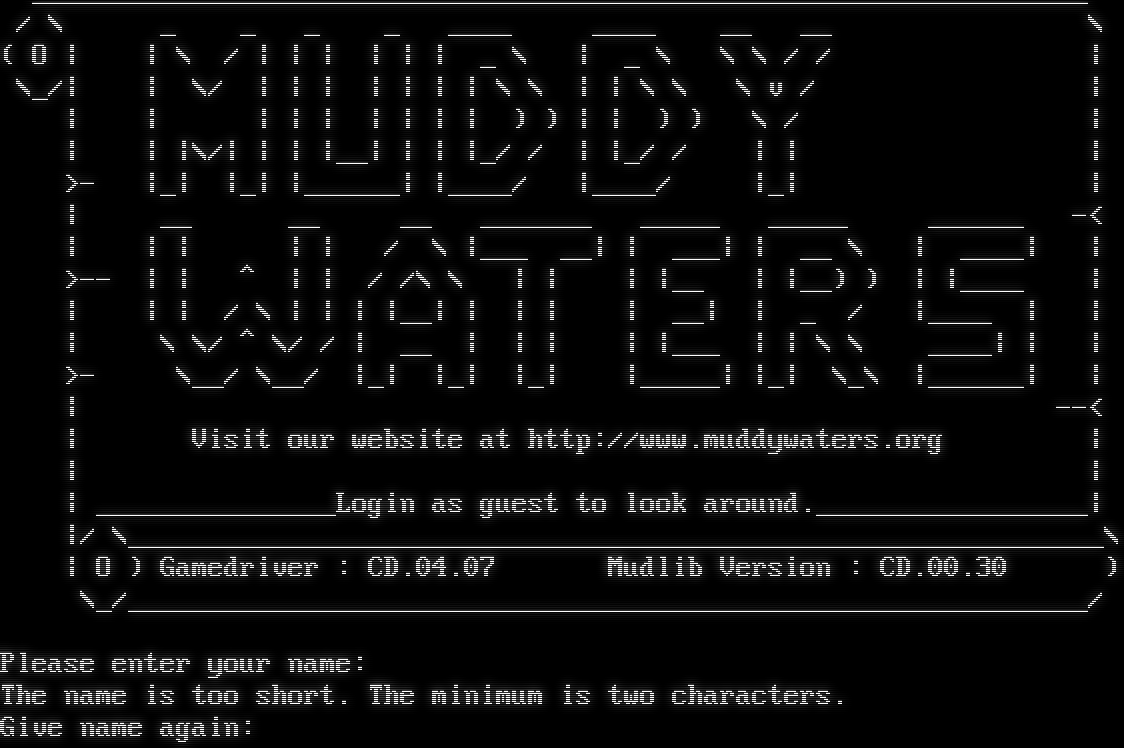 _​_________________________________________________________________ / \\ _ _ _ _ _​___ _​___ __ __ \\ ( O \| \| \\ / \| \| \| \| \| \| _ \\ \| _ \\ \\ \\ / / \| \\_/\| \| \\/ \| \| \| \| \| \| \| \\ \\ \| \| \\ \\ \\ v / \| \| \| \| \| \| \| \| \| \| ) ) \| \| ) ) \\ / \| \| \| \|\\/\| \| \| \|__\| \| \| \|_/ / \| \|_/ / \| \| \| >- \|_\| \|_\| \|_​_____\| \|_​___/ \|_​___/ \|_\| \| \| __ __ __ _​______ _​____ _​____ _​_____ -< \| \| \| \| \| / \\ \|___ __\| \| ___\| \| __ \\ \| _​___\| \| >-- \| \| ^ \| \| / /\\ \\ \| \| \| \|__ \| \|__) ) \| \|_​___ \| \| \| \| / \\ \| \| \| \|__\| \| \| \| \| __\| \| _ / \|_​___ \| \| \| \\ \\/ ^ \\/ / \| __ \| \| \| \| \|___ \| \| \\ \\ _​___\| \| \| >- \\__/ \\__/ \|_\| \|_\| \|_\| \|_​____\| \|_\| \\_\\ \|_​_____\| \| \| --< \| Visit our website at http://www.muddywaters.org \| \| \| \| _​______________Login as guest to look around.​_________________\| \|/ \\_​____________________________________________________________\\ \| O ) Gamedriver : CD.04.07 Mudlib Version : CD.00.30 ) \\_/_​___________________________________________________________/ Please enter your name: The name is too short. The minimum is two characters. Give name again: