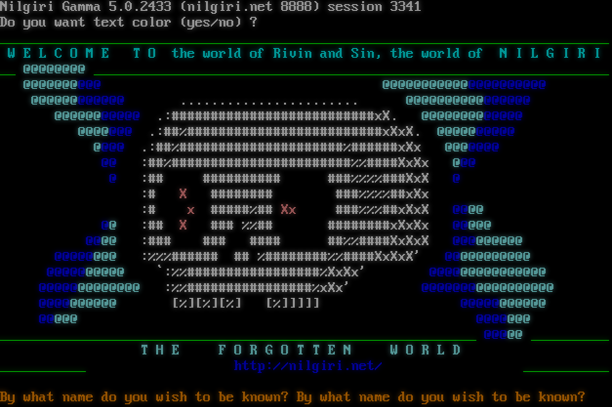 Nilgiri Gamma 5.0.2433 (nilgiri.net 8888) session 3341 Do you want text color (yes/no) ? _​_____________________________________________________________________________ W E L C O M E T O the world of Rivin and Sin, the world of N I L G I R I __ @@@@@@@@ _​_________________________________________________________________ @@@@@@@@@@ @@@@@@@@@@@@@@@@@@@@@ @@@@@@@@@@@@ .​...................... @@@@@@@@@@@@@@@@ @@@@@@@@@@@ .:#​#########################xX. @@@@@@@@@@@@@ @@@@@@@ .:##%#​########################xXxX. @@@@@@@@@@ @@@@ .:##%#​####################%#​#####xXx @@@@@@@ @@ :##%#​######################%%#​###XxXx @@@ @ :## #​######### ###%%%%###XxX @ :# X #​####### ###%%%%##xXx :# x #​####%## Xx ###%%%##xXxX @@@@ @@ :## X ### %%## #​#######xXxXx @@@@@ @@@@ :### ### #​### ##%%#​###XxXxX @@@@@@@@@ @@@@@@@@ :%%%#​##### ## %#​#######%%#​###XxXxX' @@@@@@@@@@@ @@@@@@@@@@ \`:%%#​################%XxXx' @@@@@@@@@@@@@@@ @@@@@@@@@@@@@ :%%#​###############%xXx' @@@@@@@@@@@@@@@@@ @@@@@@@@@@ [%][%][%] [%]]]]] @@@@@@@@@@@ @@@@@ @@@@@@@ _​____________________________________________________________ @@@@@ _​_________ T H E F O R G O T T E N W O R L D _​__________ http://nilgiri.net/ _​__________ By what name do you wish to be known? By what name do you wish to be known?