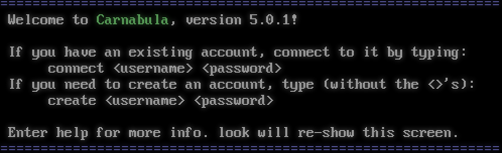 =​============================================================= Welcome to Carnabula, version 5.0.1! If you have an existing account, connect to it by typing: connect &lt;username&gt; &lt;password&gt; If you need to create an account, type (without the &lt;&gt;'s): create &lt;username&gt; &lt;password&gt; Enter help for more info. look will re-show this screen. =​=============================================================