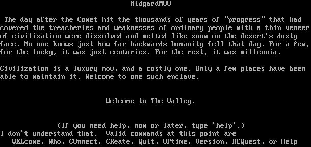 MidgardMOO The day after the Comet hit the thousands of years of "progress" that had covered the treacheries and weaknesses of ordinary people with a thin veneer of civilization were dissolved and melted like snow on the desert's dusty face. No one knows just how far backwards humanity fell that day. For a few, for the lucky, it was just centuries. For the rest, it was millennia. Civilization is a luxury now, and a costly one. Only a few places have been able to maintain it. Welcome to one such enclave. Welcome to The Valley. (If you need help, now or later, type 'help'.) I don't understand that. Valid commands at this point are WELcome, Who, COnnect, CReate, Quit, UPtime, Version, REQuest, or Help