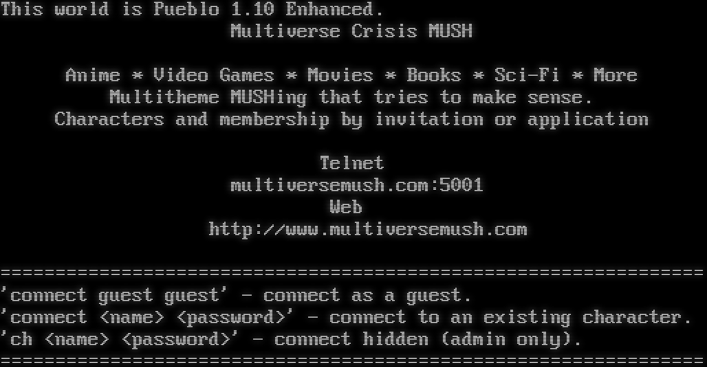This world is Pueblo 1.10 Enhanced. Multiverse Crisis MUSH Anime \* Video Games \* Movies \* Books \* Sci-Fi \* More Multitheme MUSHing that tries to make sense. Characters and membership by invitation or application Telnet multiversemush.com:5001 Web http://www.multiversemush.com =​=============================================================== 'connect guest guest' - connect as a guest. 'connect <name> <password>' - connect to an existing character. 'ch <name> <password>' - connect hidden (admin only). =​===============================================================