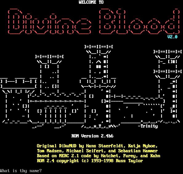 WELCOME TO ___ ___ _ _ ( _\`\\ _ _ ( _\`\\ (_ ) ( ) \| \| ) \|(_) _ _ (_) ___ __ \| (_) ) \| \| _ _ _\| \| \| \| \| )\| \|( ) ( )\| \|/' _ \`\\ /'__\`\\ \| _ <' \| \| /'_\`\\ /'_\`\\ /'_\` \| \| \|_) \|\| \|\| \\_/ \|\| \|\| ( ) \|( ___/ \| (_) ) \| \| ( (_) )( (_) )( (_\| \| (_​___/'(_)\`\\___/'(_)(_) (_)\`\\_​___) (_​___/'(___)\`\\___/'\`\\___/'\`\\__,_) V2.0 ]=I==II==I=[ \\\\__\|\|__// ]=I==II==I=[ ]=I==II==I=[ \|.. \` \*\| \\\\__\|\|__// \\\\__\|\|__// \|. /\\ #\| \|-_ []#\| \| [] \| \| ## \*\| \| \| \| ..\| \| . , #\| ]=I==II==I=[ ___ _​___ ___ \| .. \| __ \|.​.__.\*\| __ \\\\__\|\|__// ] I---I I--I [ \|.. \| \| \|\|_\| \|_\|\| \| \| _\*\| ]_​____________[ \| .. []\| \\--\\-\|-\|--/-// \| _ #\| \\_\\\| \|_\| \|/_/ \|_ _ \| _ _ _\| ' \*\| \|\` \*\| \| . \|'-'-\` '-\` '-\` '-\` '-\` \| [] #\|-\|--\|-​_-_-_-_ _ _ _\|_' #\| \| ' \|=​-=-=-=-=-=-=-=-=-=-=-\| []\*\|-​----________\` \` \` ] \*\| \| \` \` []\| _​-_-_-_-_ ' \|- #\| , ' \`\`\`\`\`\`\`[' _#\| \| ' \` '\| [] \| \| \| \| \| []\` \| [] \*\| \` . \` \|' I\*\| \| - \| \` \| \| \| \| \| \` \| ; ' #\| . \| ' \| #\| /_'_​-_-___-\\__,__\|_\|_\|_\|_\|_​______\| \` , \*\| _​_______+__,__,-/.​_.._.\\ _,--' __,-' /,_,_v_Y_,_v\\\\-' -Trinity ROM Version 2.4b6 Original DikuMUD by Hans Staerfeldt, Katja Nyboe, Tom Madsen, Michael Seifert, and Sebastian Hammer Based on MERC 2.1 code by Hatchet, Furey, and Kahn ROM 2.4 copyright (c) 1993-1998 Russ Taylor What is thy name?
