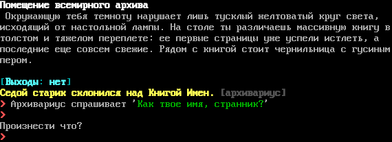 DREAMLAND 4.0 by Ruffina, Filths, Taiphoen, Kerrad, Bast ('help credits') ,"\| $$$$$$$$ $$$$$$$ $$$$$$$$ $$ $$$$ $$$$ A $$ $$ $$ $$ $$ $$ $$ $$$ $$ / \\ ,"\| $$ $$ $$ $$ $$ $ $ $ $$ $$$$ $$$ ,"\| [""M# A $$ $$ $$$$$$ $$$$ $ $$ $$ $$ $ $$ A \| # /.\\ $$ $$ $$ $$ $$ $ $ $$$$$$$$ $$ $$$ $$ /.\\ [""M# [""M# $$ $$ $$ $$ $$ $$ $$ $$$ $$ $ $$ [""M# \| # U"U#U $$$$$$$$ $$$$ $$$ $$$$$$$$ $$$$ $$$$$ $$$$ $$$$ \| # \| # \\ .:/ \| # \| #​___\| # $$$$ $$ $$$$ $$$$$ $$$$$$$$ \| "--' .-" $$ $$ $$$$ $$$ $$ $$ \|"​-"-"-"-"-#-#-## $$ $ $$ $ $$ $ $$ $$ \| D # ## #​##### $$ $ $$ $ $$ $ $$ $$ \\ L .::::'/ $$ $ $$$$$$$$ $ $$$ $$ $$ \\ ::::'/ $$ $$ $$ $$$ $$$ $$$ $$ $$ :8a\| # # ## $$$$$$$$ $$$$ $$$$$ $$$$$ $$$$ $$$$$$$$ ::88a ### ::::::888a88aLA :::::::::::::::a8a https://dreamland.rocks :::::8::::888:Y8888 telnet dreamland.rocks 9000 :: ::::88a::::88a:Y88a ' .: ::Y88a:::::8a:Y88a .:: :::Y88as88a...s88aa 1. KOI8-U 2. ALT (CP866) 3. WIN (CP1251) 4. ISO (ISO-8859-5) 5. MAC 6. Translit 7. UTF-8 Please select your Ukrainian or Russian codepage: Помещение всемирного архива Окружающую тебя темноту нарушает лишь тусклый желтоватый круг света, исходящий от настольной лампы. На столе ты различаешь массивную книгу в толстом и тяжелом переплете: ее первые страницы уже успели истлеть, а последние еще совсем свежие. Рядом с книгой стоит чернильница с гусиным пером. [Выходы: нет] Седой старик склонился над Книгой Имен. [архивариус] > Архивариус спрашивает 'Как твое имя, странник?' > Произнести что? >