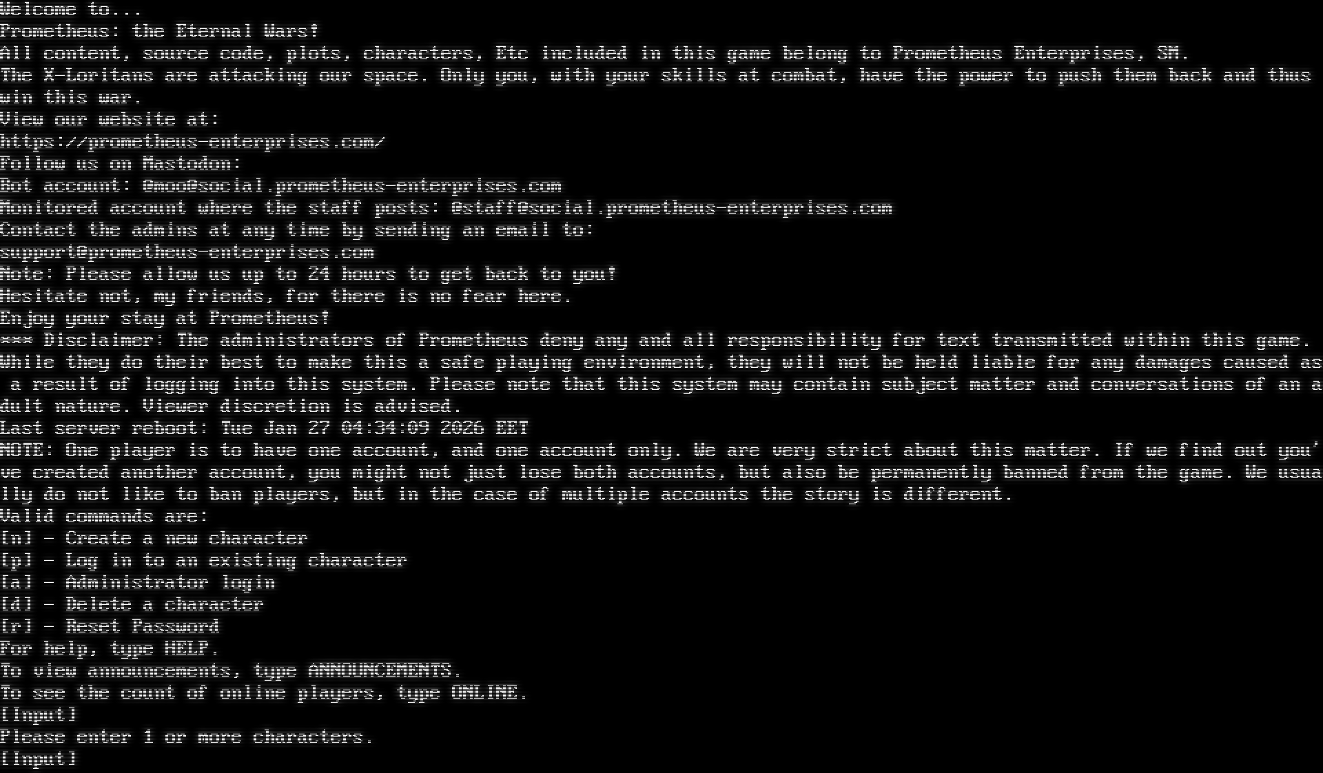 Welcome to... Prometheus: the Eternal Wars! All content, source code, plots, characters, Etc included in this game belong to Prometheus Enterprises, SM. The X-Loritans are attacking our space. Only you, with your skills at combat, have the power to push them back and thus win this war. View our website at: https://prometheus-enterprises.com/ Follow us on Mastodon: Bot account: @moo@social.prometheus-enterprises.com Monitored account where the staff posts: @staff@social.prometheus-enterprises.com Contact the admins at any time by sending an email to: support@prometheus-enterprises.com Note: Please allow us up to 24 hours to get back to you! Hesitate not, my friends, for there is no fear here. Enjoy your stay at Prometheus! \*\*\* Disclaimer: The administrators of Prometheus deny any and all responsibility for text transmitted within this game. While they do their best to make this a safe playing environment, they will not be held liable for any damages caused as a result of logging into this system. Please note that this system may contain subject matter and conversations of an adult nature. Viewer discretion is advised. Last server reboot: Tue Jan 27 04:34:09 2026 EET NOTE: One player is to have one account, and one account only. We are very strict about this matter. If we find out you've created another account, you might not just lose both accounts, but also be permanently banned from the game. We usually do not like to ban players, but in the case of multiple accounts the story is different. Valid commands are: [n] - Create a new character [p] - Log in to an existing character [a] - Administrator login [d] - Delete a character [r] - Reset Password For help, type HELP. To view announcements, type ANNOUNCEMENTS. To see the count of online players, type ONLINE. [Input] Please enter 1 or more characters. [Input]