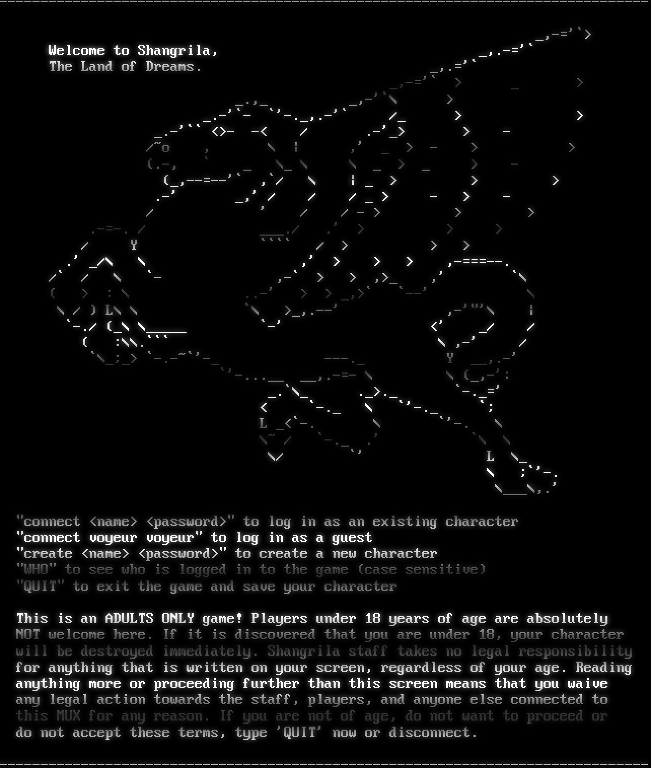 -​------------------------------------------------------------------------------- _,-='\`> Welcome to Shangrila, _,.-='\` The Land of Dreams. _,.='\` _,-='\` > _ > _.,_ _,-'\`\\ > _.-'\`- \`'-._,.-'\` /_ > > _.-'\`\` <>- -< / .-'_> > - /~o , \\ \| ,' _ > - > > (.-, \` _ \\_ \\ \\ _ > _ > - (_,-​-=--'\` ,\`/ \\ \| _ > > > .-' _,' / / / _ > - > - / ' / / - > > > .​-=-. / _​__./ .' > > > / Y \`\`\`\` / > > > .' _/\\ \\ ,' > > > ,-​===--. /\` / \\ \`- ,-\` > > ,>_ ,' \`\\ ( > : \\ ..-' > > _,>\` \`--' \\ \\ / ) L\\ \\ \`\\ >_,.--' ,-'"'\\ \| \`-./ (_\\ \\_​____ \`-' <' _/ / ( :\\\\.\`\`\` \\ ,-' / \`\\_;_> \`-​.-~\`'-_ -​--._ Y __,.-' \`'-​...__ __,.​-=- \\ \\ (_,-': _.\`\\_ ._>._ \`-​._=' < \`-._ \\ \`'-._ \`; L _<\`-. \\ \`'-. \\ \\~ / \`-._ .' \`\\ \\ \\/ \`' L \\_ \\ ;\`'-. \\___\\,.' "connect <name> <password>" to log in as an existing character "connect voyeur voyeur" to log in as a guest "create <name> <password>" to create a new character "WHO" to see who is logged in to the game (case sensitive) "QUIT" to exit the game and save your character This is an ADULTS ONLY game! Players under 18 years of age are absolutely NOT welcome here. If it is discovered that you are under 18, your character will be destroyed immediately. Shangrila staff takes no legal responsibility for anything that is written on your screen, regardless of your age. Reading anything more or proceeding further than this screen means that you waive any legal action towards the staff, players, and anyone else connected to this MUX for any reason. If you are not of age, do not want to proceed or do not accept these terms, type 'QUIT' now or disconnect. -​-------------------------------------------------------------------------------