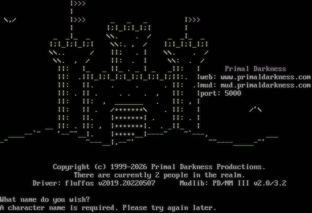 \|>>> \| \\,/ \|>>> _ _ _ \|>>> \| \|;\|_\|;\|_\|;\| \| _ _\|_ _ \\\\. . / _ _\|_ _ \|;\|_\|;\|_\|;\| \\\\:. , / \|;\|_\|;\|_\|;\| \\\\.. / \|\|; . \| \\\\. . / \\\\. , / \|\|: . \| \\\\: . / \|\|: \|_ _ \|\|_ . _ \| _ _\|\|: \| Primal Darkness \|\|: .\|\|\|_\|;\|_\|;\|_\|;\|_\|;\|_\|;\|\|:. \|web: www.primaldarkness.com \|\|: \|\|. . . . \|\|: .\|mud: mud.primaldarkness.com \|\|: . \|\| . . . . , \|\|: \|port: 5000 \|\|: \|\|: , _​______ . \|\|: , \| \|\|: \|\| . /+​++++++\\ . \|\|: \| /'\\ \|\|: \|\|. \|+​++++++\| . \|\|: . \| __ \|\|: . \|\|: , \|+​++++++\|. . _\|\|_ \| _​___--\`~ '-​-~~__\|. \|+​++++__\|-​---~ ~\`---, ___ -~ ~​---__\|,--~' ~​~----_____-~' Copyright (c) 1999-2026 Primal Darkness Productions. There are currently 2 people in the realm. Driver: fluffos v2019.20220507 Mudlib: PD/NM III v2.0/3.2 What name do you wish? A character name is required. Please try again later.