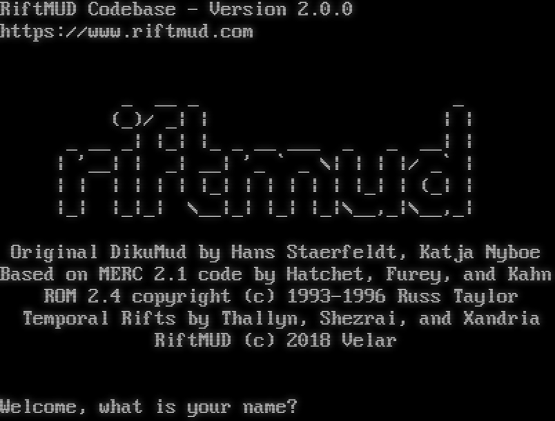 RiftMUD Codebase - Version 2.0.0 https://www.riftmud.com _ __ _ _ (_)/ _\| \| \| \| _ __ _\| \|_\| \|_ _ __ ___ _ _ __\| \| \| '__\| \| _\| __\| '_ \` _ \\\| \| \| \|/ _\` \| \| \| \| \| \| \| \|_\| \| \| \| \| \| \|_\| \| (_\| \| \|_\| \|_\|_\| \\__\|_\| \|_\| \|_\|\\__,_\|\\__,_\| Original DikuMud by Hans Staerfeldt, Katja Nyboe Based on MERC 2.1 code by Hatchet, Furey, and Kahn ROM 2.4 copyright (c) 1993-1996 Russ Taylor Temporal Rifts by Thallyn, Shezrai, and Xandria RiftMUD (c) 2018 Velar Welcome, what is your name?