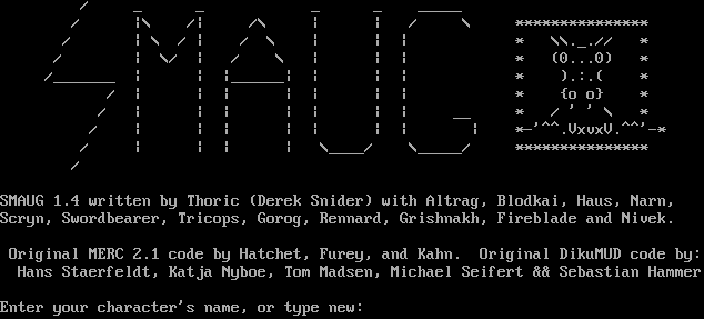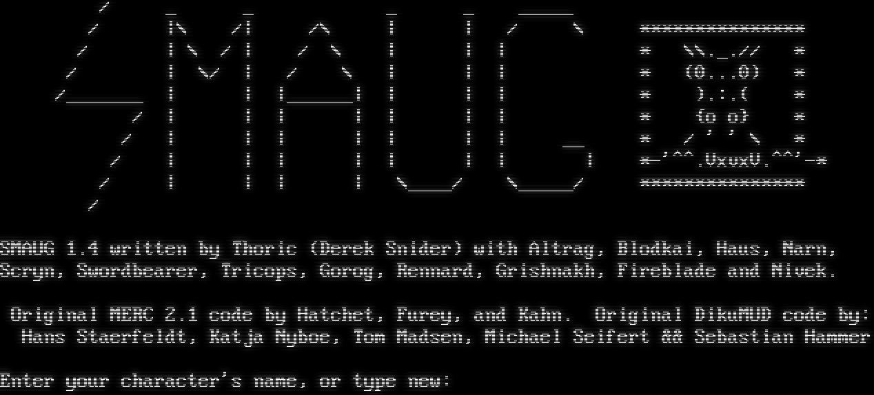 / _ _ _ _ _​____ / \|\\ /\| /\\ \| \| / \\ \*\*\*\*\*\*\*\*\*\*\*\*\*\*\* / \| \\ / \| / \\ \| \| \| \* \\\\._.// \* / \| \\/ \| / \\ \| \| \| \* (0...0) \* /_​______ \| \| \|_​_____\| \| \| \| \* ).:.( \* / \| \| \| \| \| \| \| \* {o o} \* / \| \| \| \| \| \| \| __ \* / ' ' \\ \* / \| \| \| \| \| \| \| \| \*-'^^.VxvxV.^^'-\* / \| \| \| \| \\_​___/ \\_​____/ \*\*\*\*\*\*\*\*\*\*\*\*\*\*\* / SMAUG 1.4 written by Thoric (Derek Snider) with Altrag, Blodkai, Haus, Narn, Scryn, Swordbearer, Tricops, Gorog, Rennard, Grishnakh, Fireblade and Nivek. Original MERC 2.1 code by Hatchet, Furey, and Kahn. Original DikuMUD code by: Hans Staerfeldt, Katja Nyboe, Tom Madsen, Michael Seifert && Sebastian Hammer Enter your character's name, or type new: